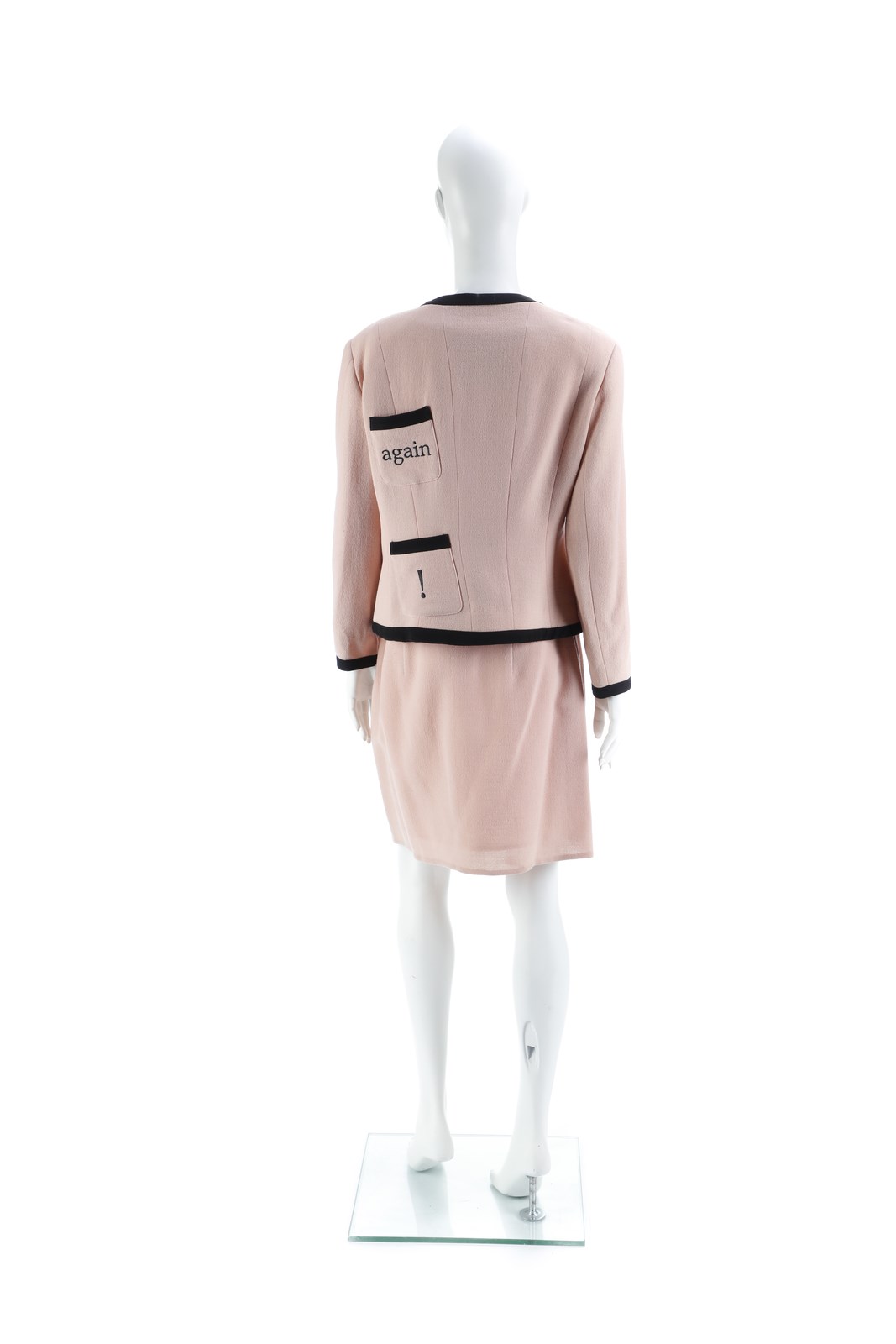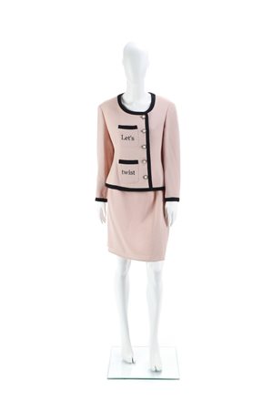 BY MOSCHINO CHEAP AND CHIC Tailleur nei toni del rosa, completo di gonna e giacca "Let's Twist Again".Anni 90.