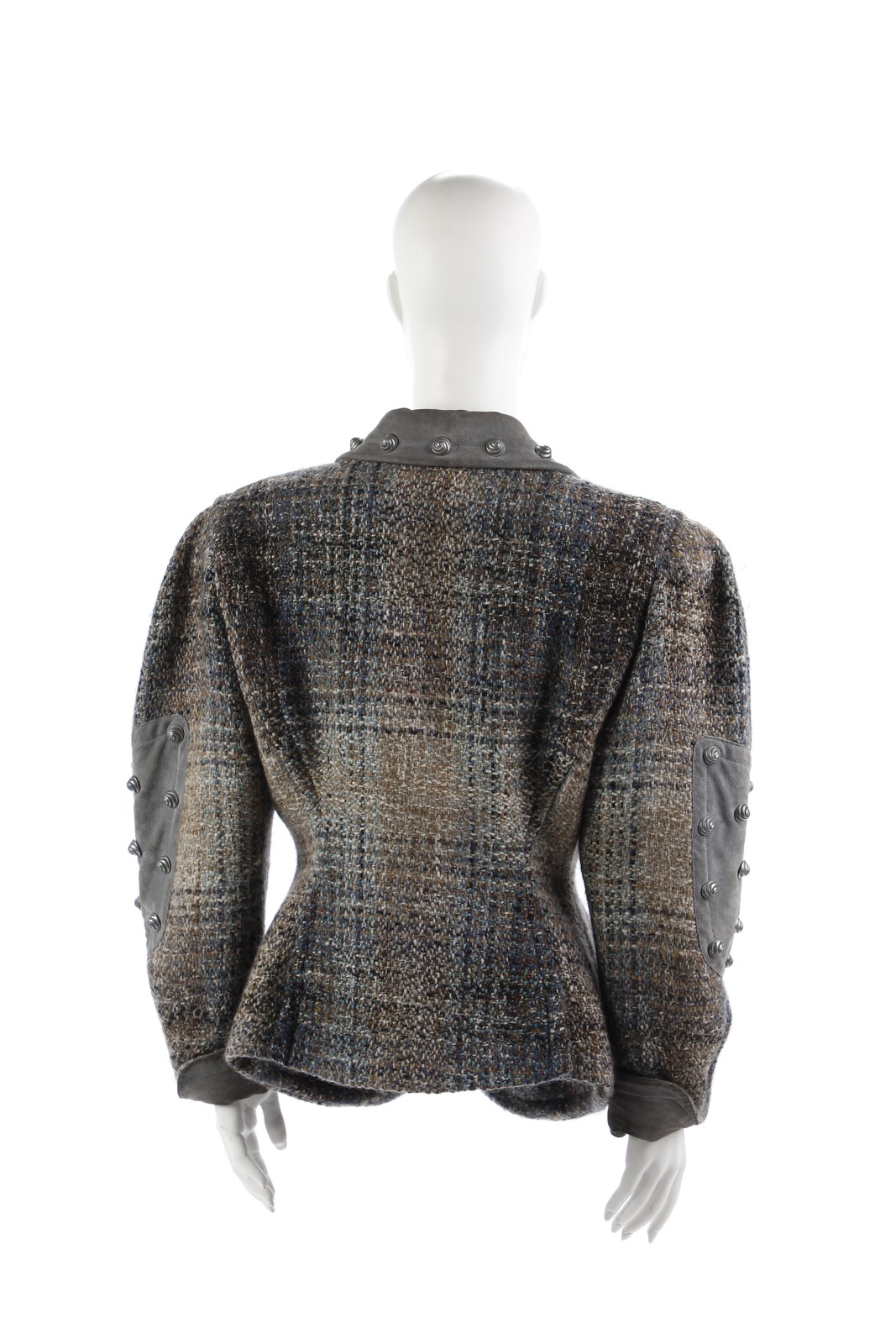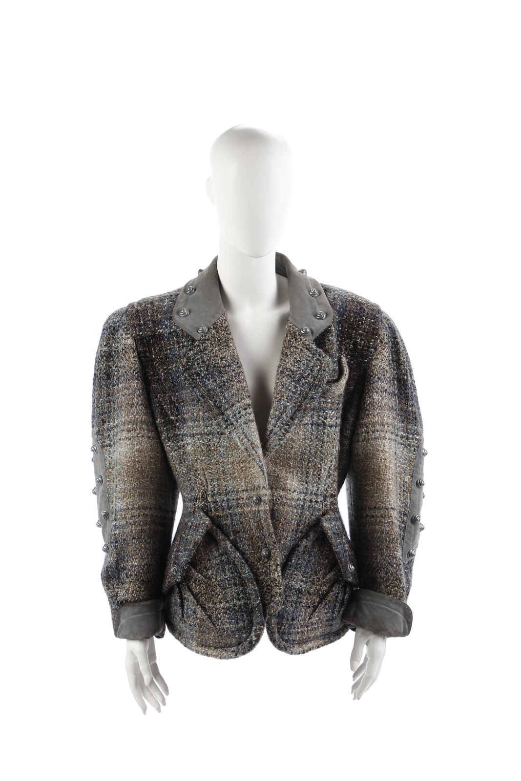 MUGLER THIERRY - Giacca in lana a motivo tartan con borchie e inserti in pelle scamosciata. Grandi tasche applicate in diagonale sul davanti. .