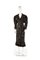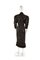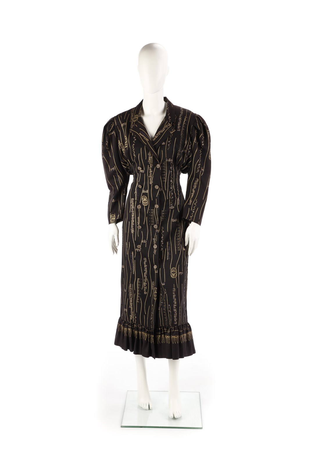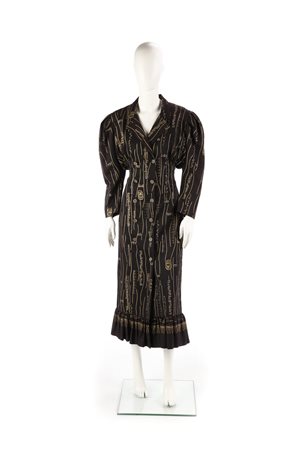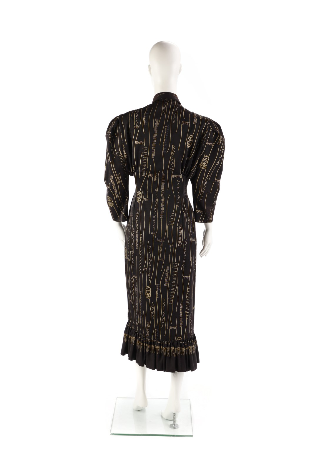 RHODES ZANDRA Abito nero maniche lunghe con colletto e stampa in oro a motivi etnici. 1970. Acetato. .