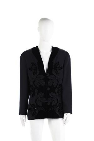 SCHON MILA - Giacca in seta e pelle con ricami in velluto e perline nere.