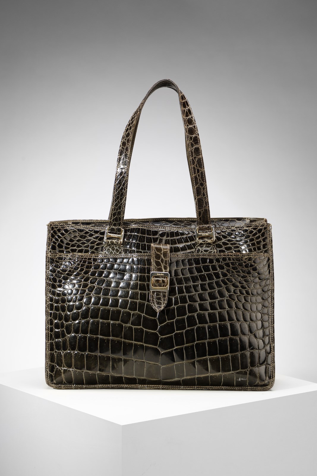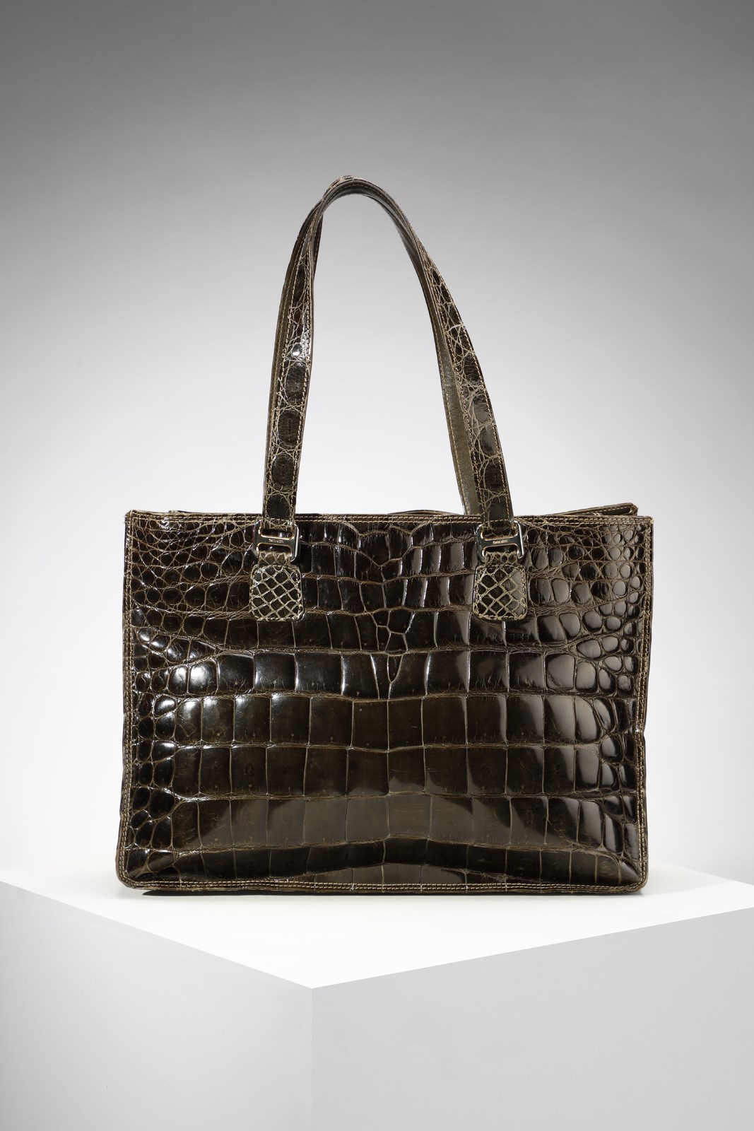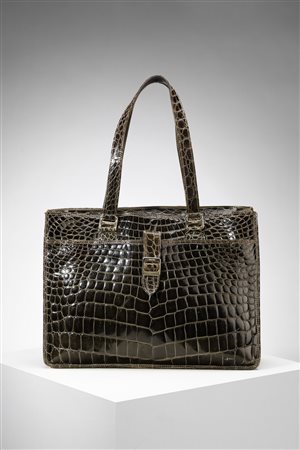 DONNA ELISSA Borsa a spalla in pelle verde stampa cocco. Tessuto e pelle. Cm 36,00 x 26,00 x 10,00. Doppia tasca interna, galvanica oro. Marchio all'interno e sulla fibia. Difetti.