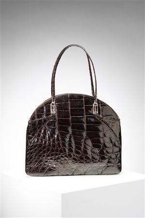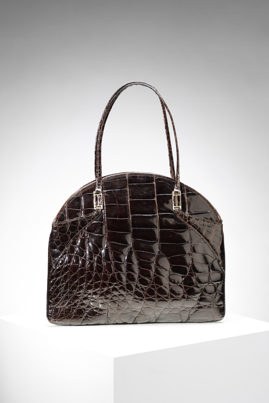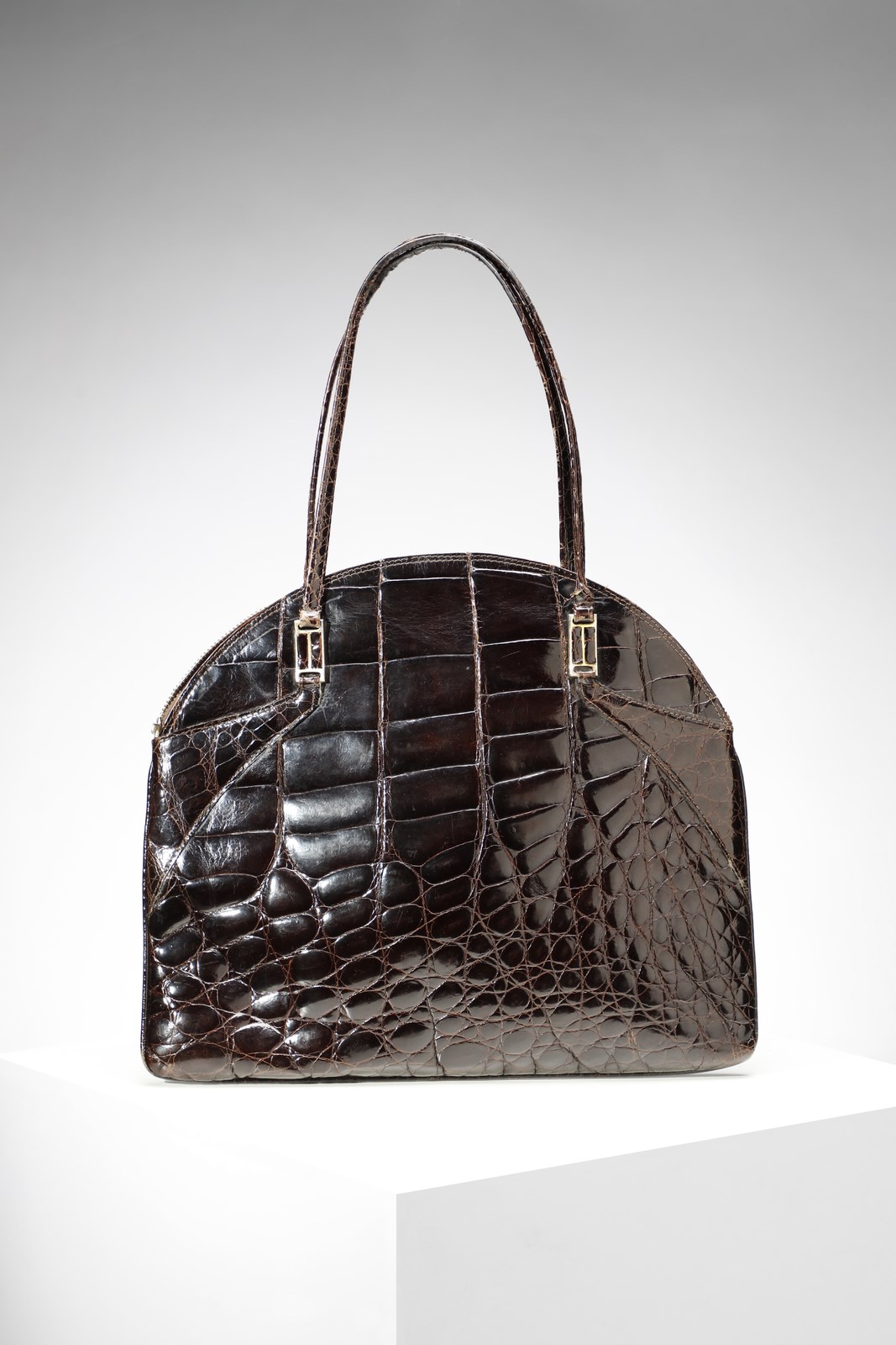 COLOMBO MILANO Borsa a mano in pelle marrone stampa cocco. Pelle di coccodrillo. Cm 34,00 x 31,00. Segni di usura. Difetto in chiusura della zip. Nessuna etichetta presente.