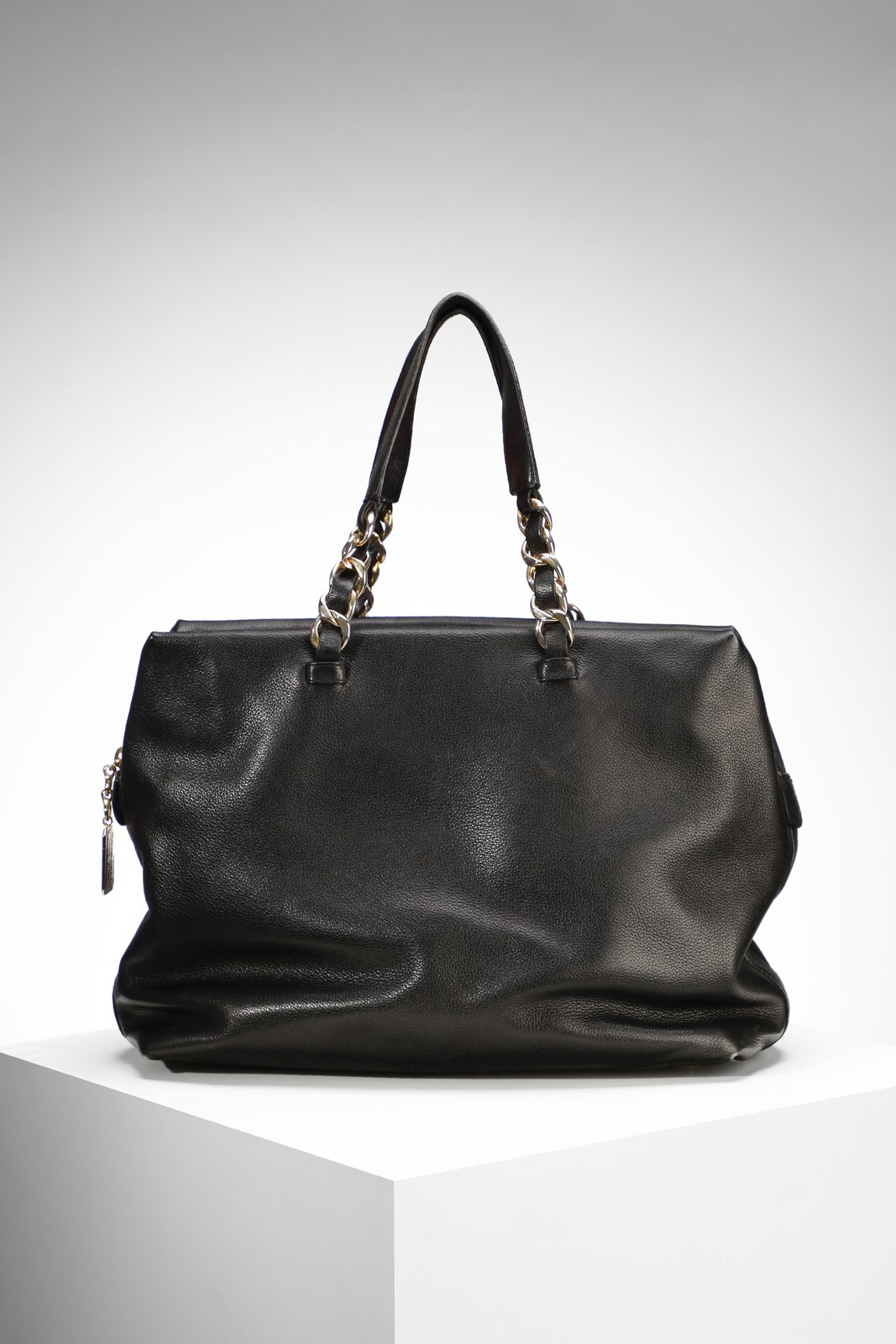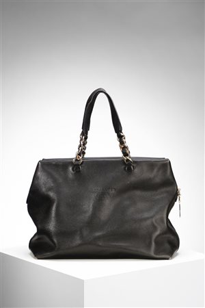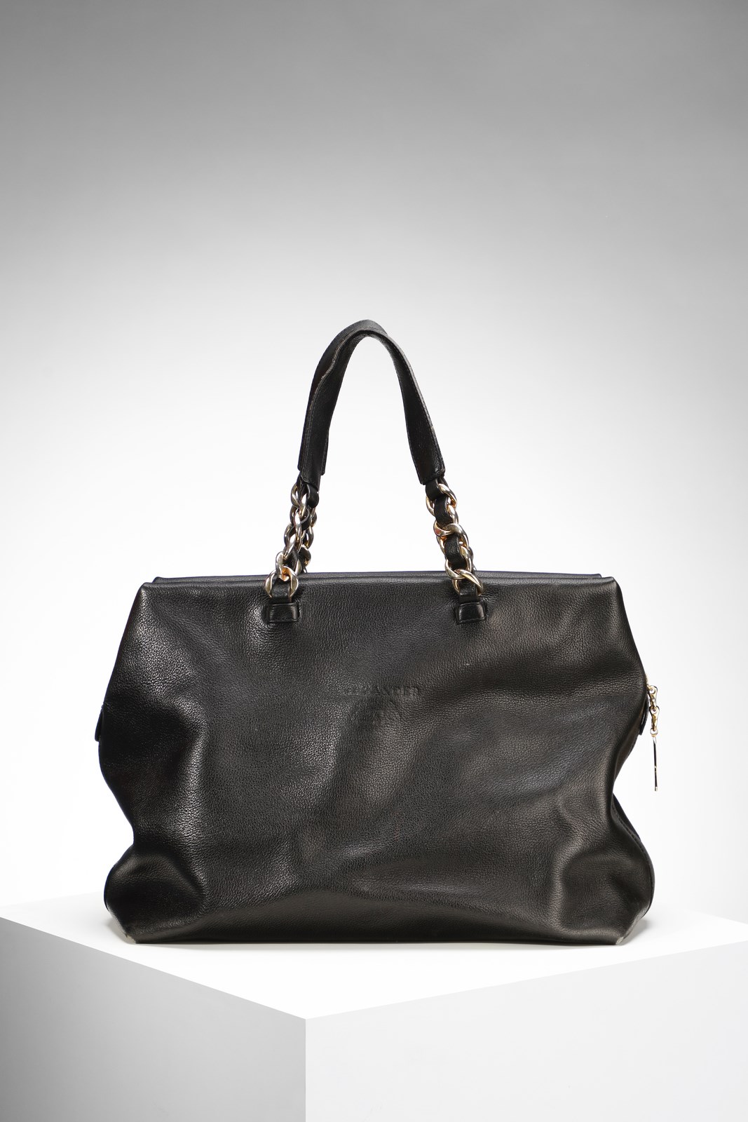 ALEXANDER Borsa a mano in pelle nera e catene in metallo dorato. Pelle di vitello. Cm 35,00 x 20,00 x 14,00. Borsa in pelle nera, tasca interna, Galvanica dorata. Marchio impresso al fronte.