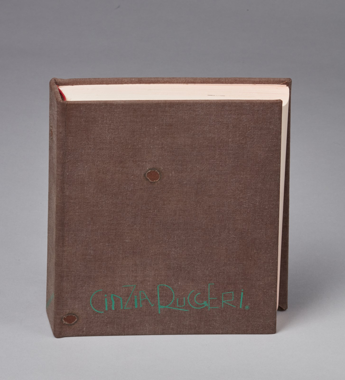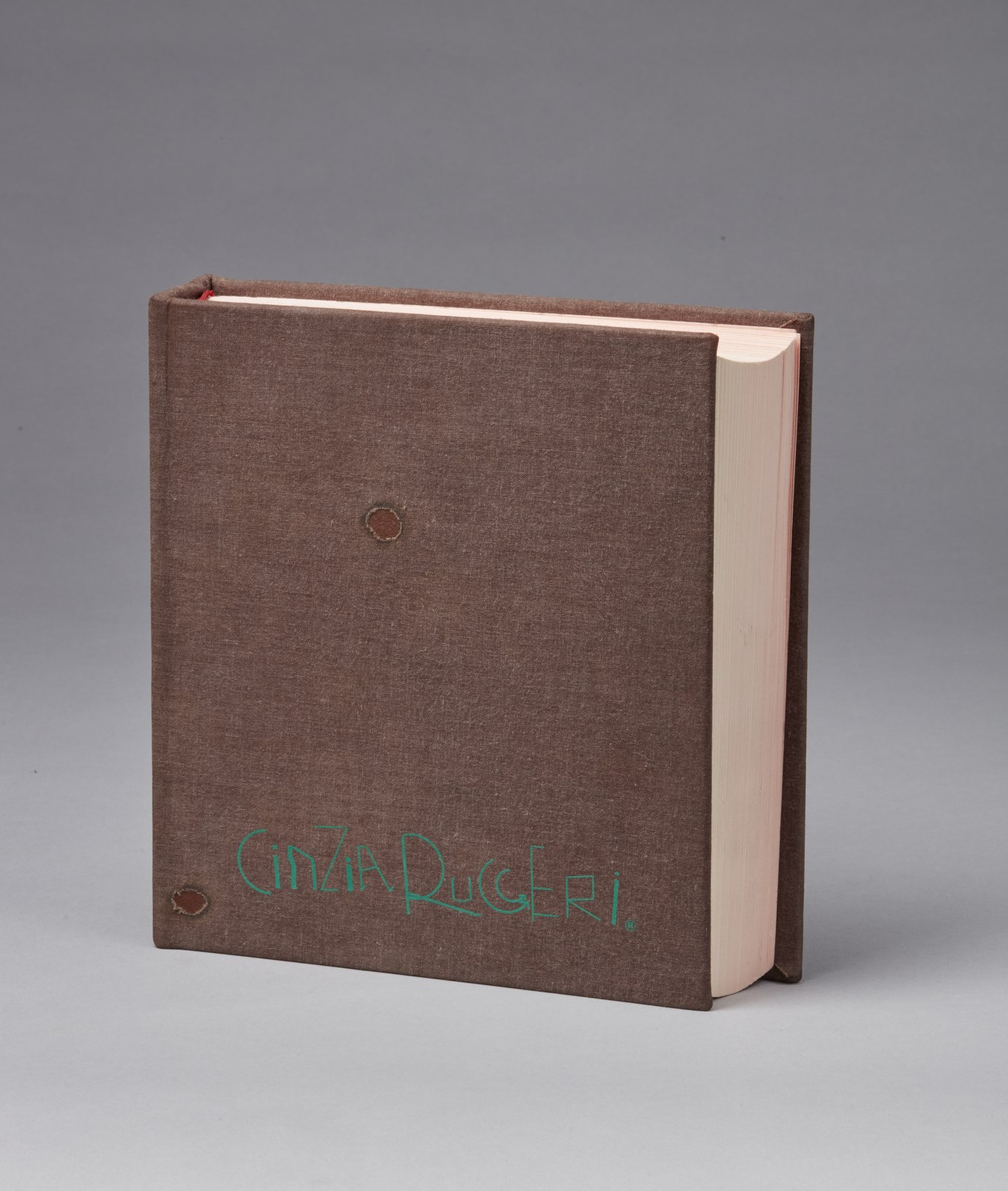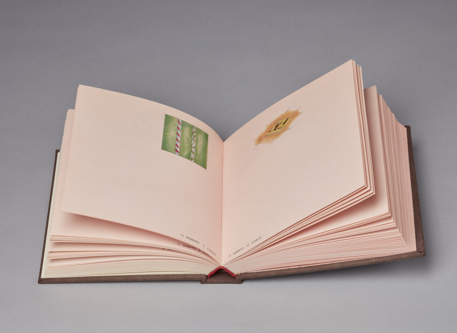 RUGGERI CINZIA Agenda, il tempo come spirale di pietre preziose. Ogni pagina è caratterizzata da un disegno, per un totale di 365 differenti disegni.Taglio diagonale della carta e della copertina. Carta in rosa degrade. Tecnica mista su carta su cartone. .