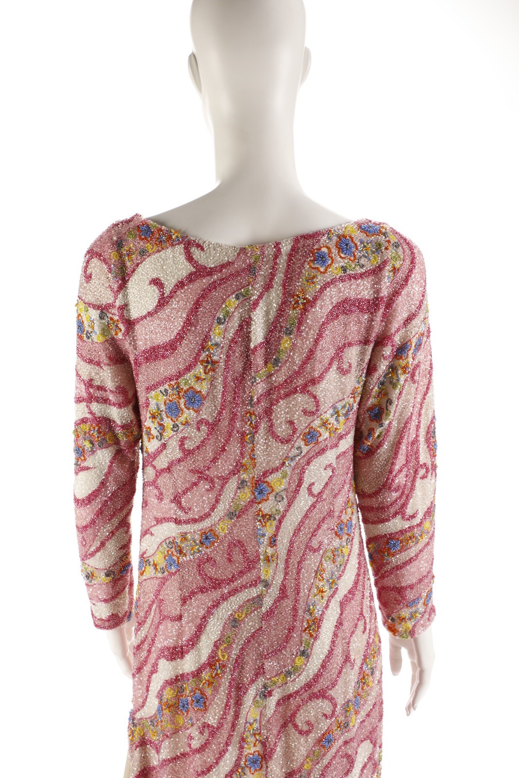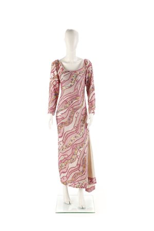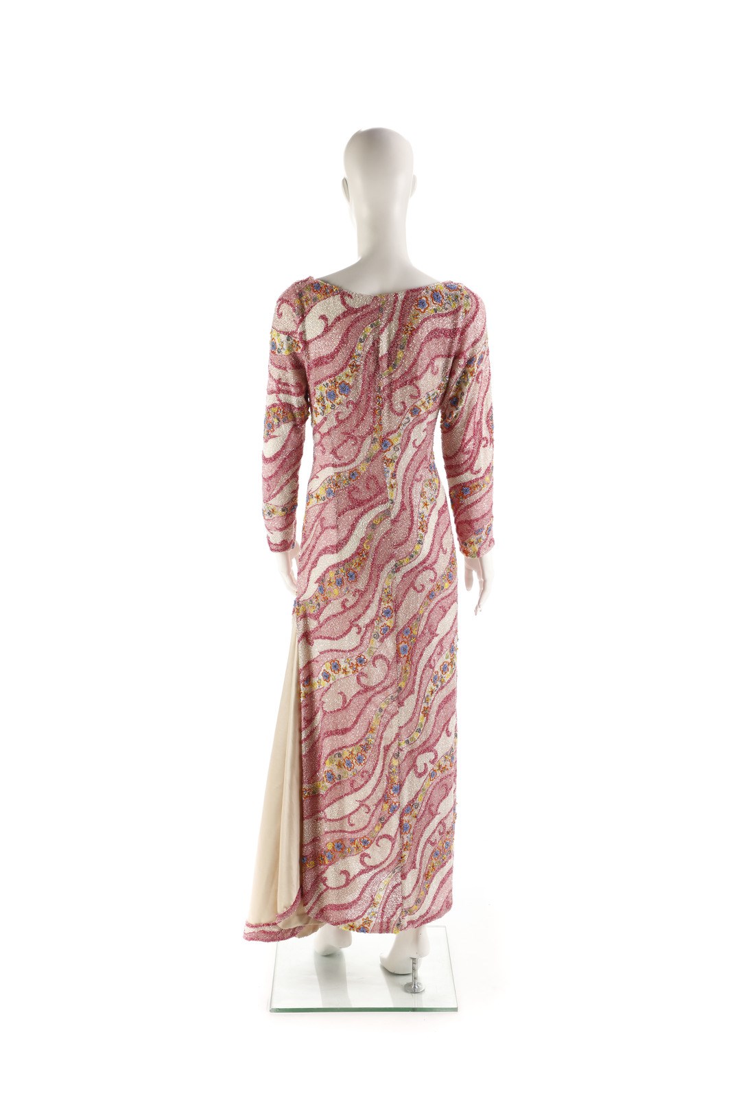 AUTORE NON IDENTIFICATO Abito di alta sartoria, lungo completamente ricamato nei toni del rosa, bianco e azzurro. Premiere Montenapoleone Milano. Seta. . Provenienza: collezione privata, Monza.