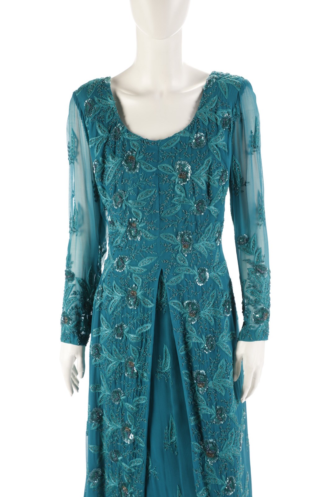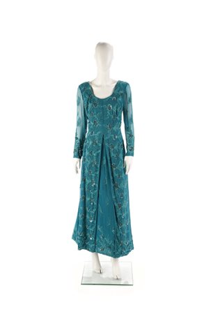 AUTORE NON IDENTIFICATO Abito di alta sartoria lungo, in seta con ricami, colore verde. Premiere Montenapolene. Seta. . Provenienza: collezione privata, Monza.
