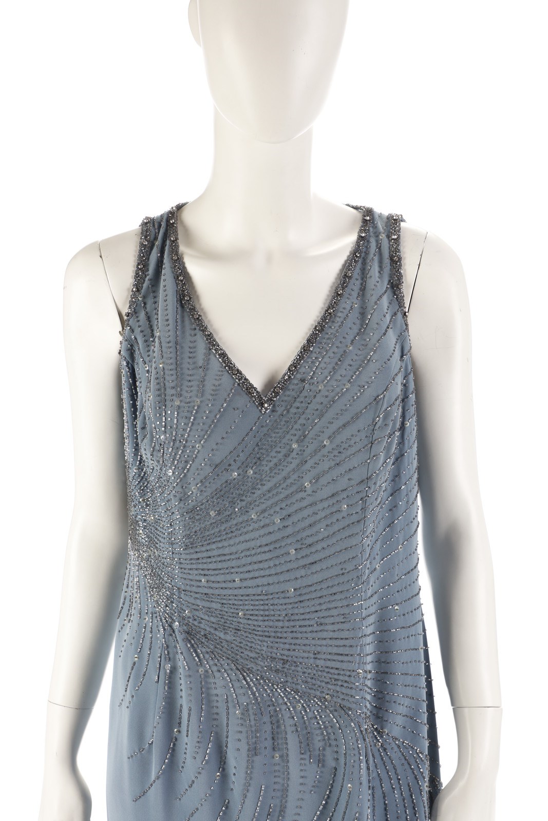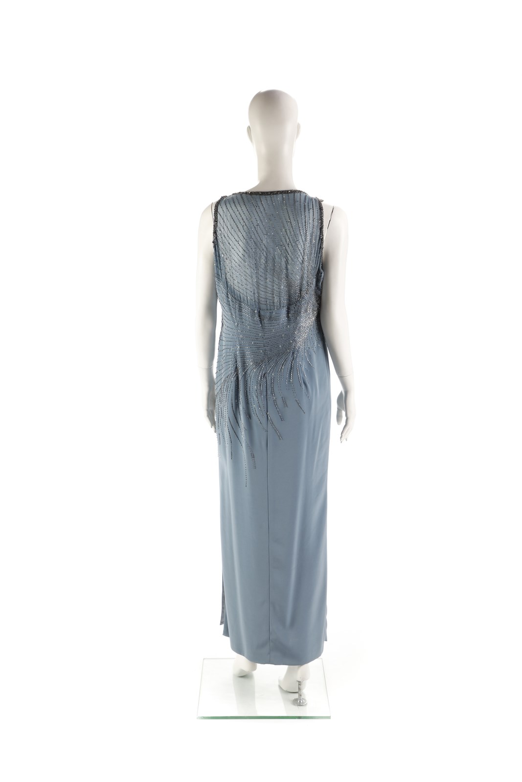 AUTORE NON IDENTIFICATO Abito alta sartoria lungo senza maniche, azzurro carta da zucchero, con ricamo. Milano, via Montenapolene. Seta. . Provenienza: collezione privata, Monza.