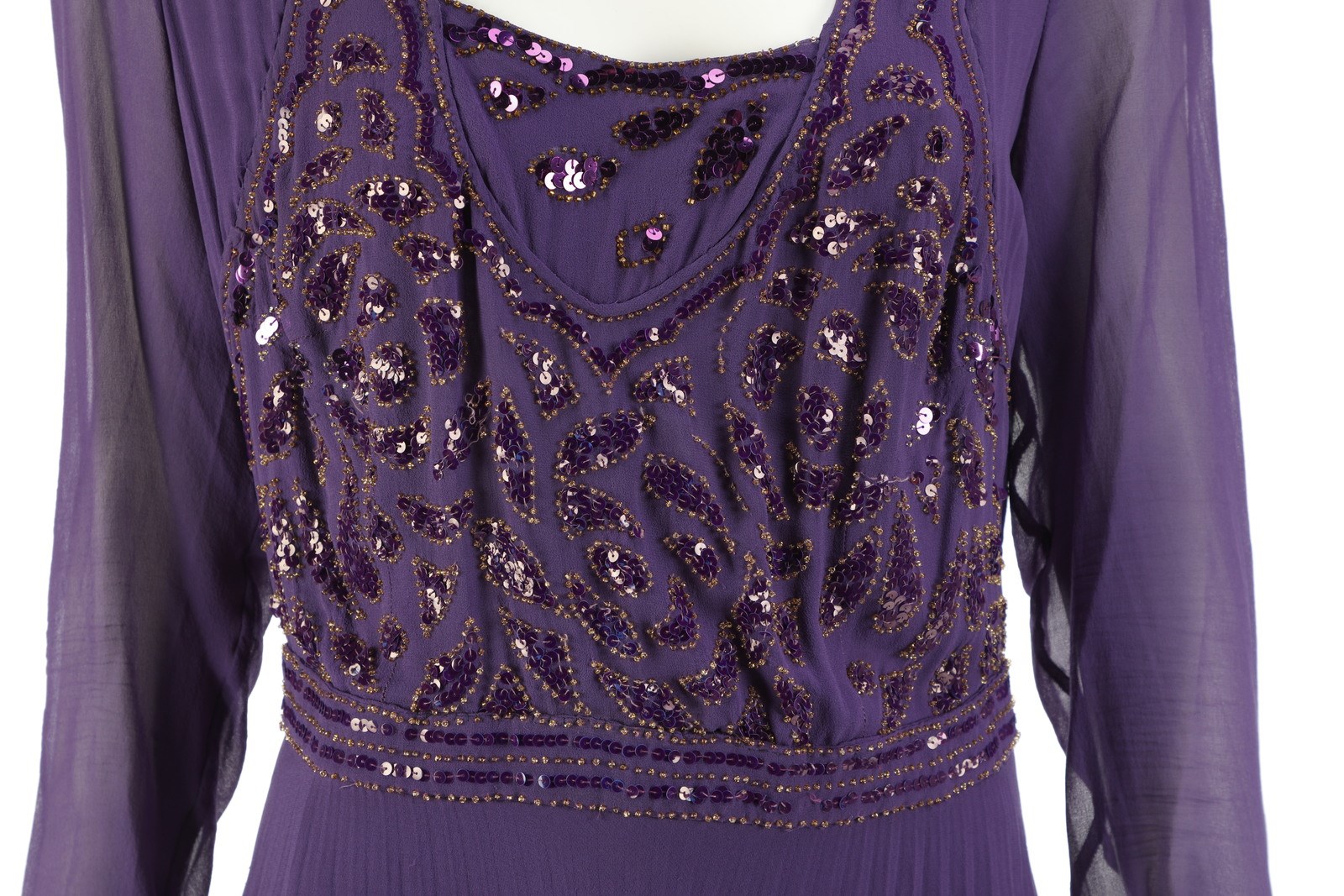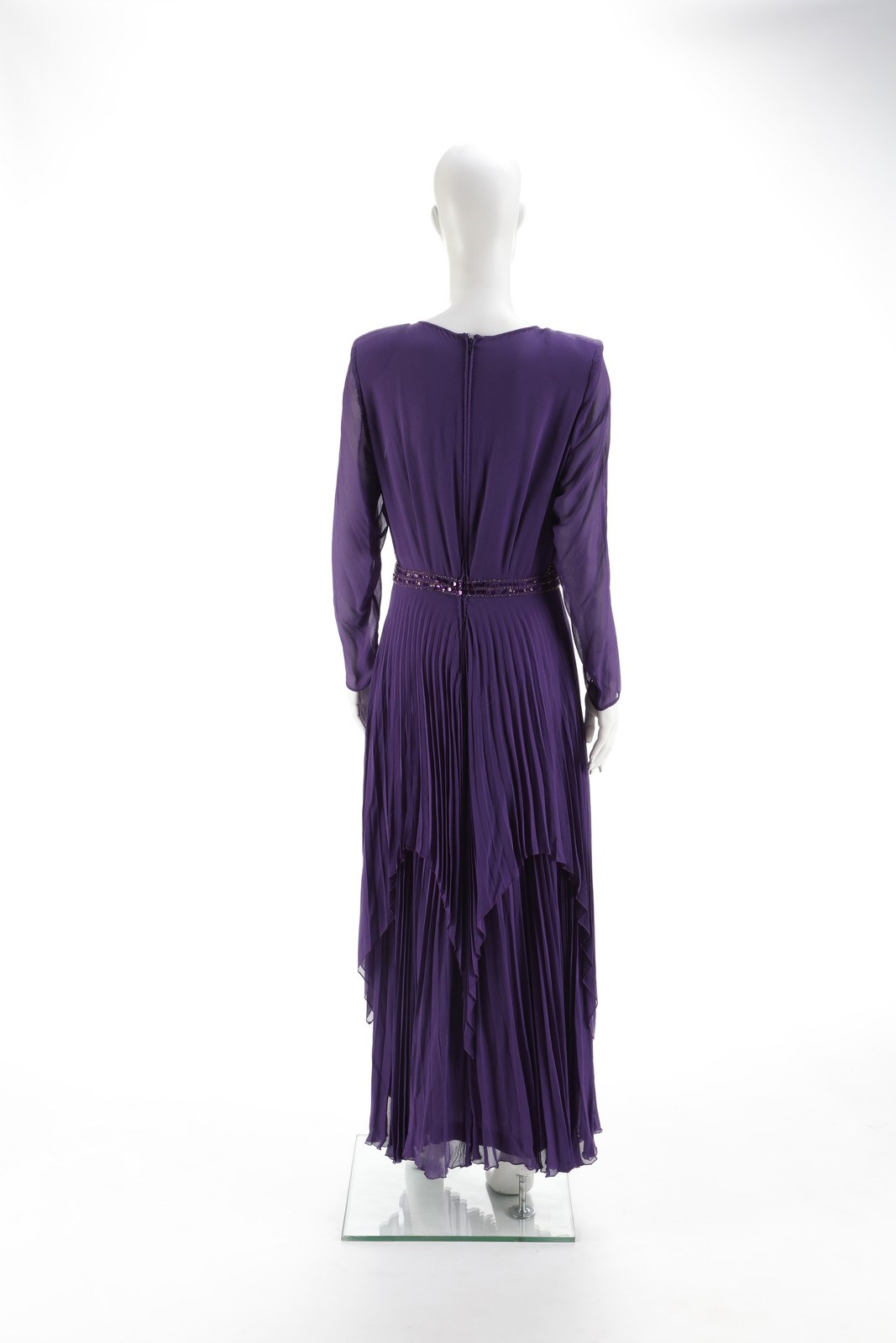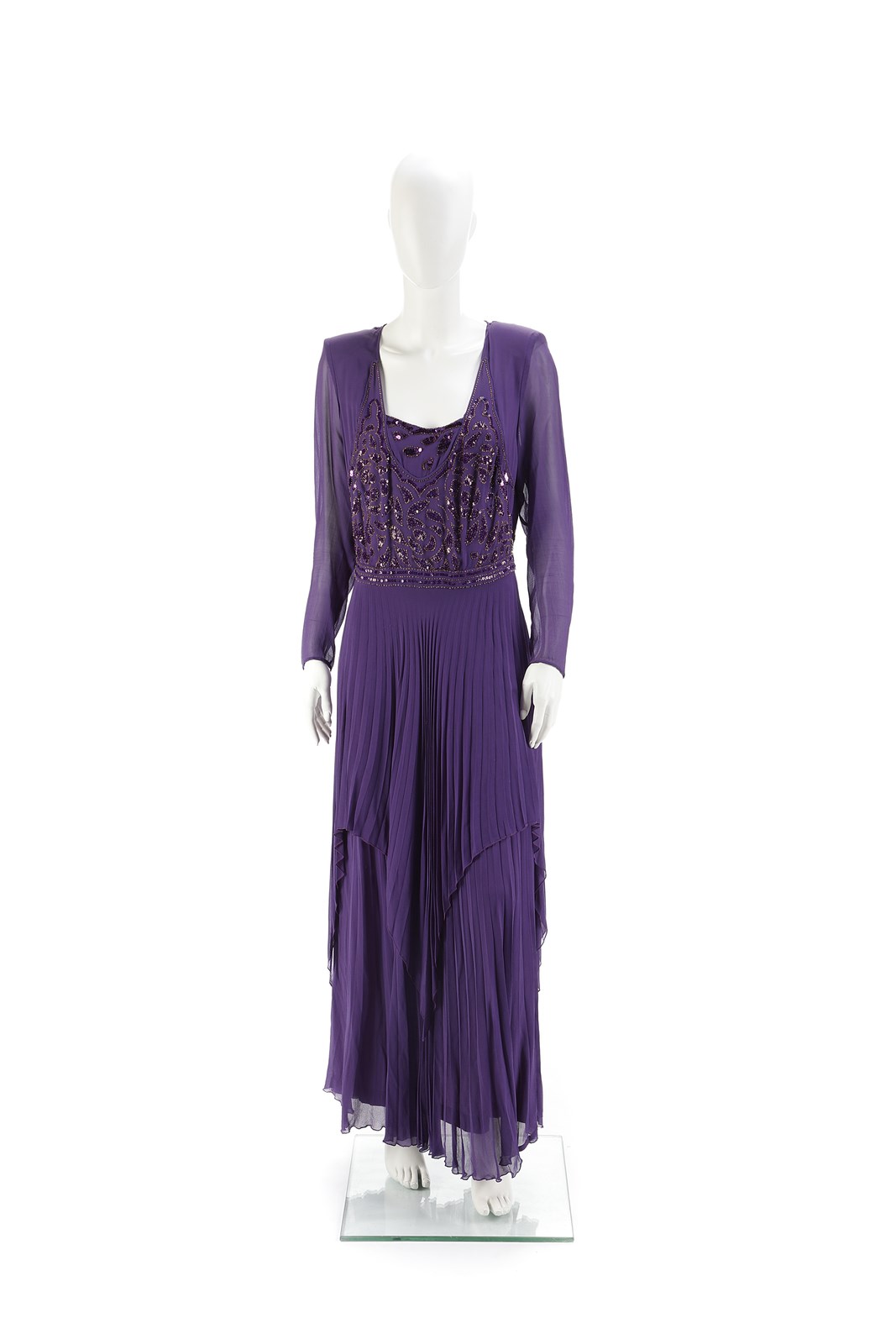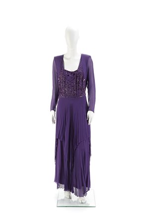 AUTORE NON IDENTIFICATO Abito lungo con maniche viola, alta sartoria,con ricami. Milano. Pizzo e seta. . Provenienza: collezione privata, Monza.