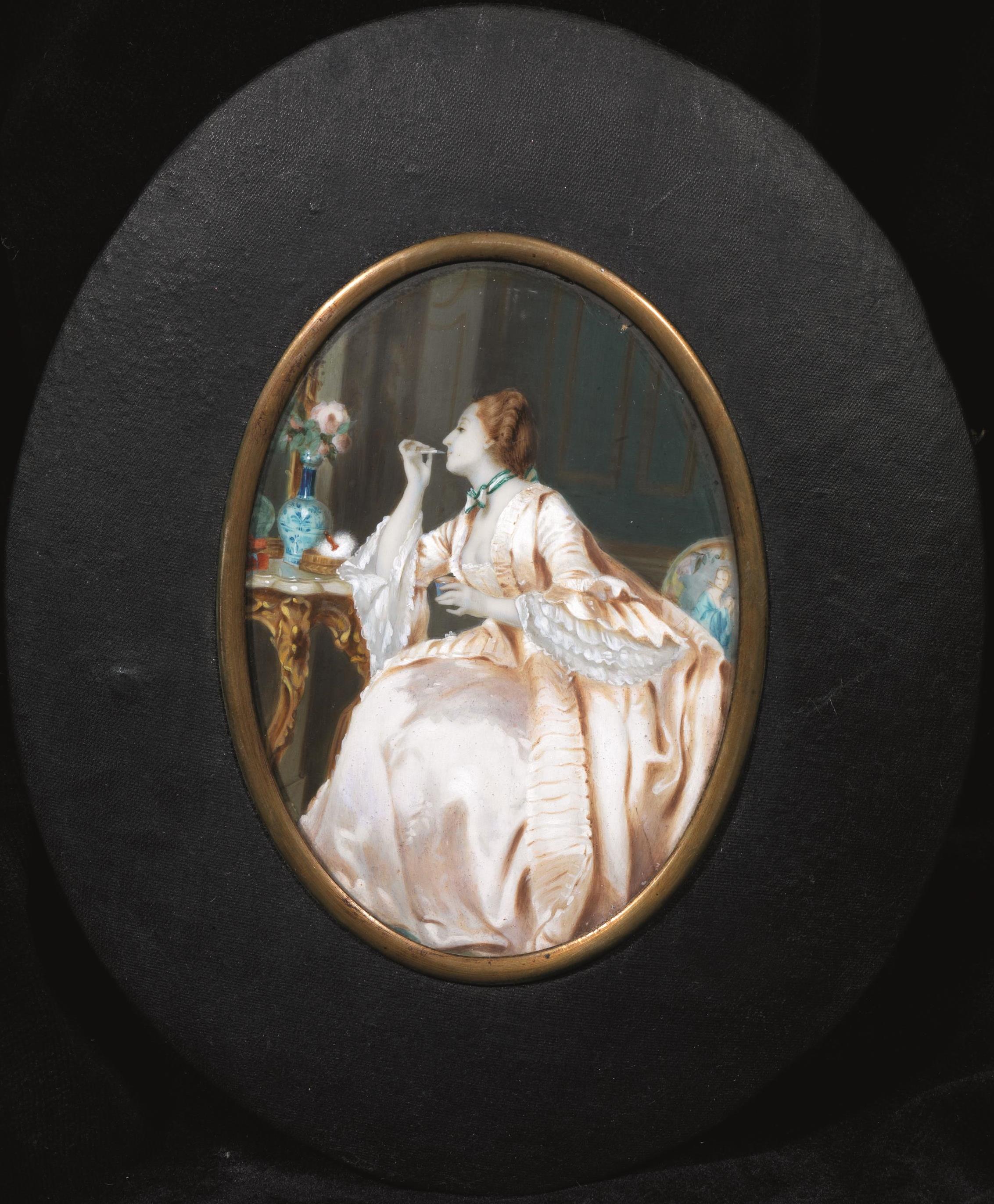 a) Scuola francese, sec. XIXGENTILDONNA ALLA TOILETTEminiatura su avorio, cm...