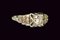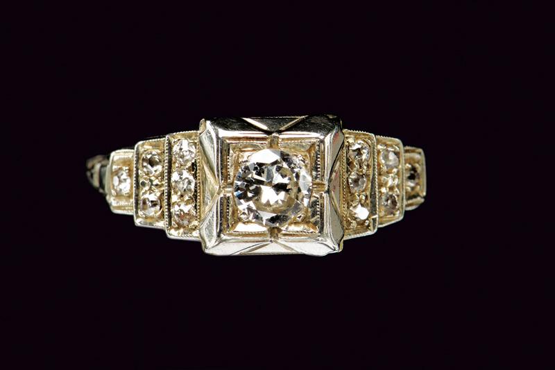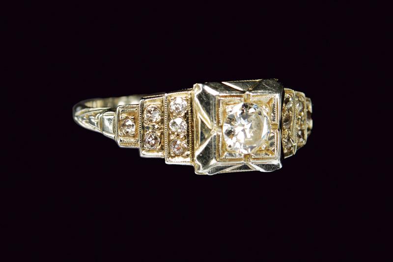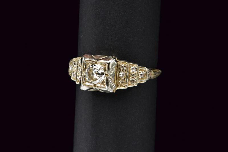 Anello in oro bianco 750/000 con diamante centrale taglio misto di 0.30 ct e diamanti taglio vecchia miniera ai lati. Punzonato 18K. Misura 14, peso 3,65 gr.
