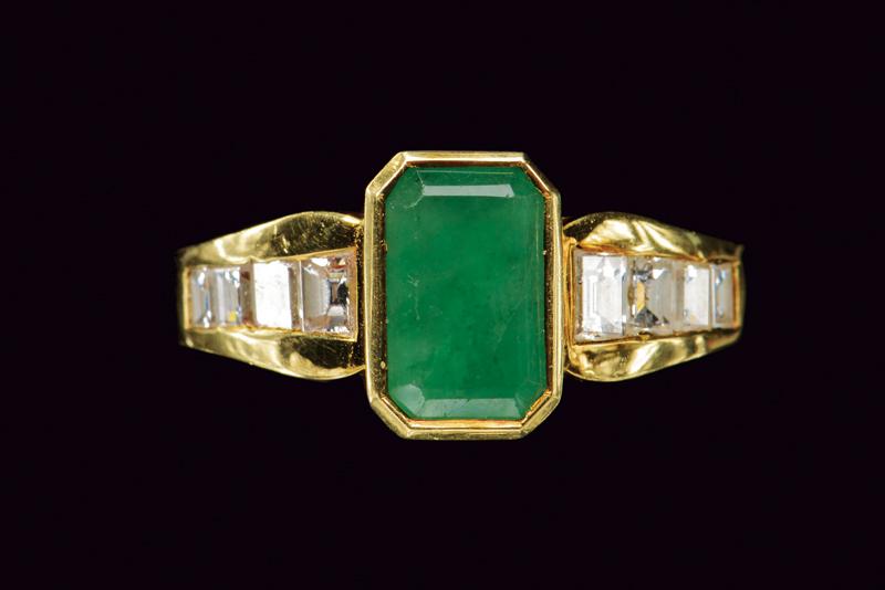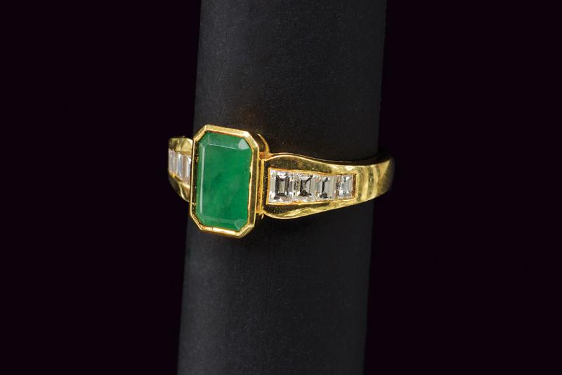 Anello in oro giallo 750/000 con smeraldo centrale ottagonale e diamanti taglio baguette per tot 0.3 ct. Misura 17,5. peso 5,2 gr