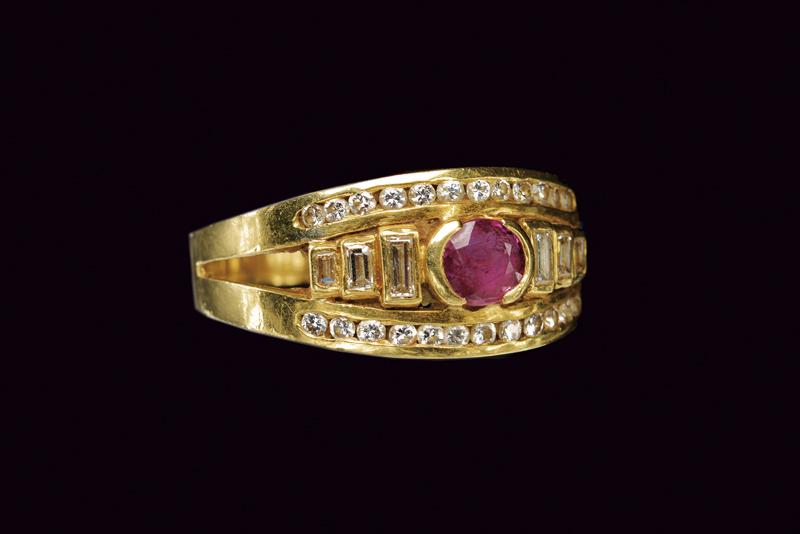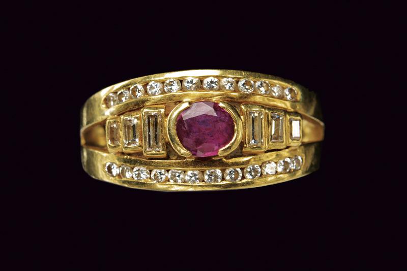 Anello in oro giallo 750/000 con rubino ovale centrale tra due file di diamanti taglio brillante inframezzate da una fila di diamanti taglio baguette per tot 1.14 ct ca. Misura 16, peso 6 gr.