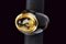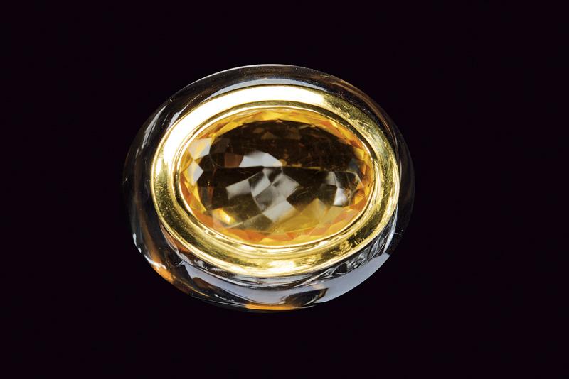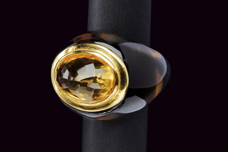 Anello bombato a fascia realizzato in quarzo fumé con incastonato al centro un cabochon sfaccettato in quarzo citrino entro castone in oro giallo 750/000. Misure del quarzo citrino mm 18 x 13, altezza mm 5. Misura dell'anello 12 1/2. Altezza totale sul dito mm 15 ca.