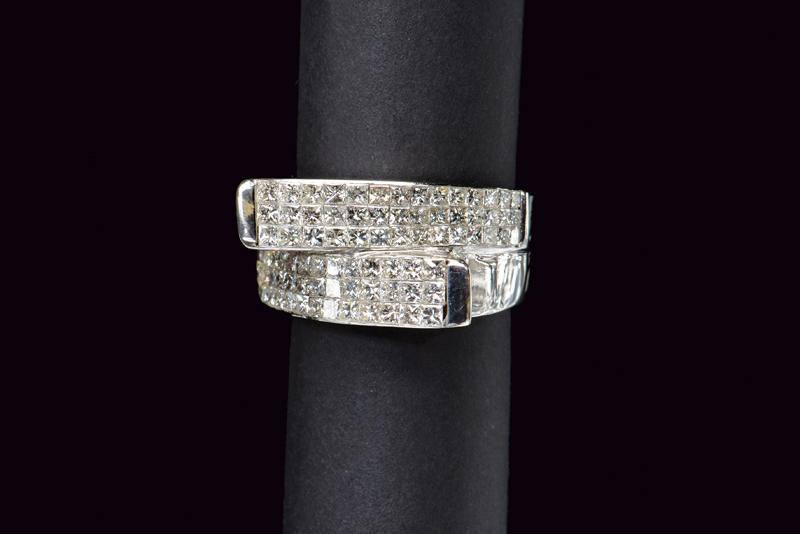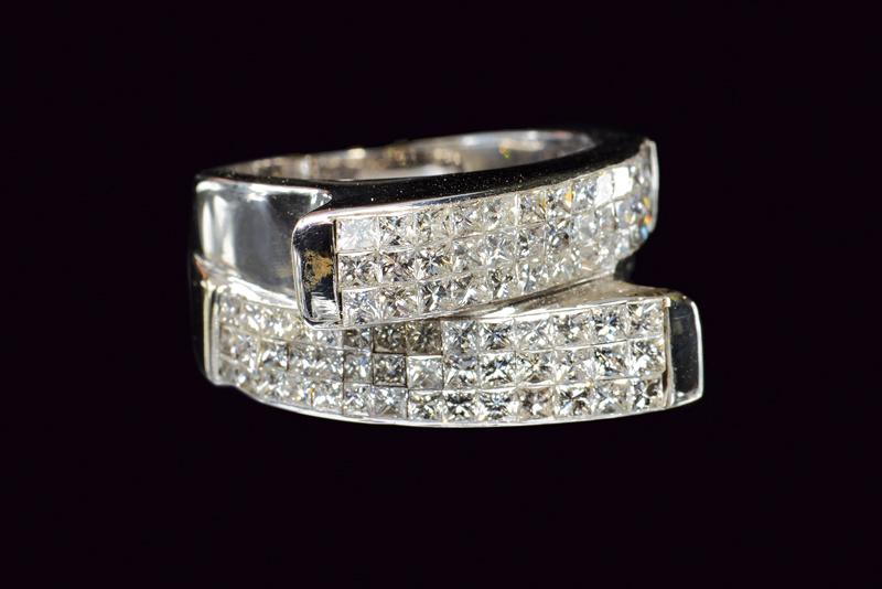 Anello oro bianco 750/000 a doppia fascia incrociata impreziosito da diamanti taglio princess di 2.14 ct. Misura 12, peso 10,6 gr