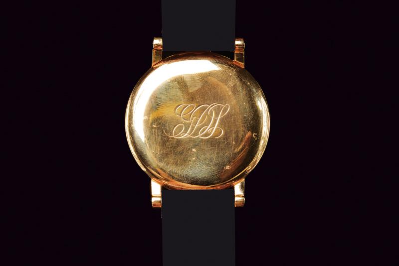 Orologio IWC in oro rosa modello tasca modificato. Cifre e tacche di colore nero, lancette in oro rosa, Misura del quadrante 46 mm. Iniziali GDL incise in Italico sul retro della cassa. Peso lordo incluso bracciale 74,2 gr