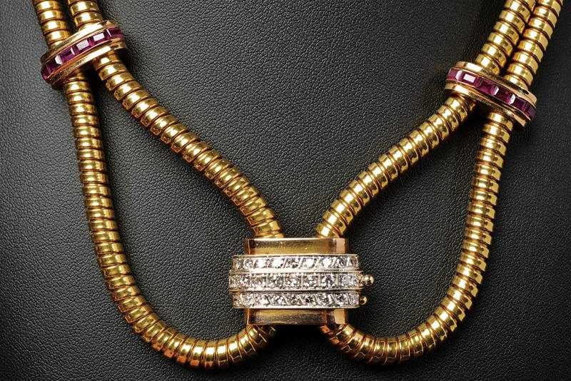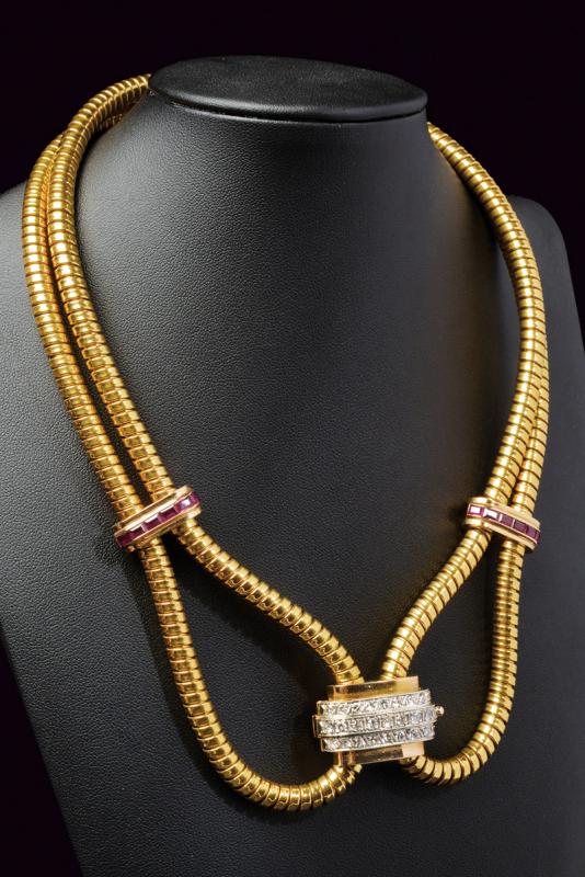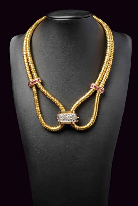 Collana girocollo tubogas in oro giallo 750/000 di forma a sezione tonda a due fili con inseriti due elementi geometrici con al centro rubini di sintesi taglio baguette, importante fermezza centrale impreziosita da 3.0 ct circa di diamanti taglio huit-huit. Peso 105 gr
