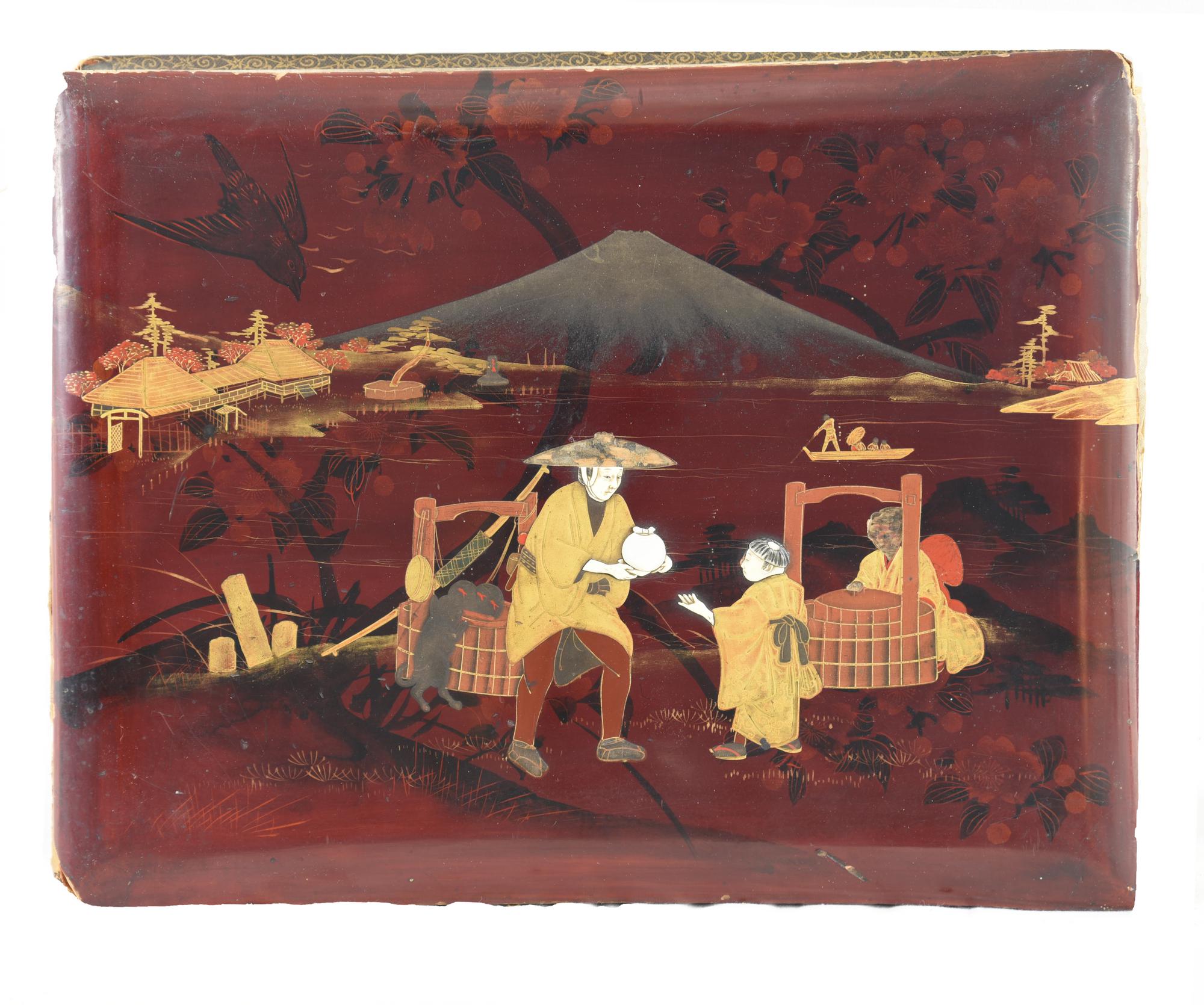 Piatto anteriore in lacca dipinto, decorato con veduta del Monte Fuji e personaggi, piccoli intarsi in madreperla, alcuni mancanti, dorso in lacca decorato con veduta panoramica.