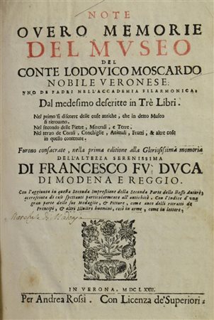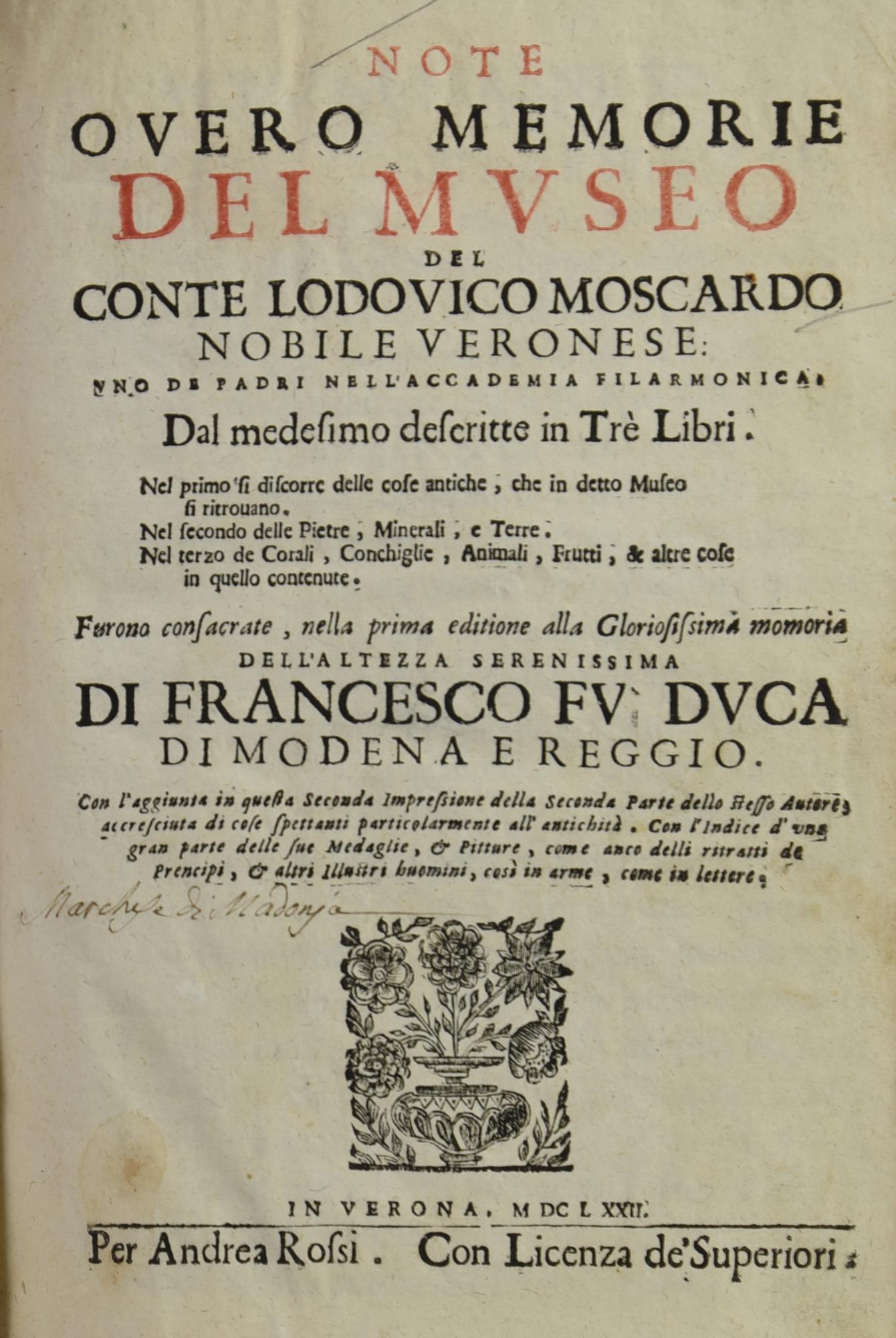 Note: overo memorie del museo del conte Lodovico Moscardo, nobile veronese, uno de padri nell'Accademia filarmonica, dal medesimo descritte in tre libri. Nel primo si discorre delle cose antiche, che in detto museo si ritrovano. Nel secondo delle Pietre, Minerali e Terre. Nel terzo di Corali, Conchiglie, Animali, Frutti, e altre cose in quello contenute.