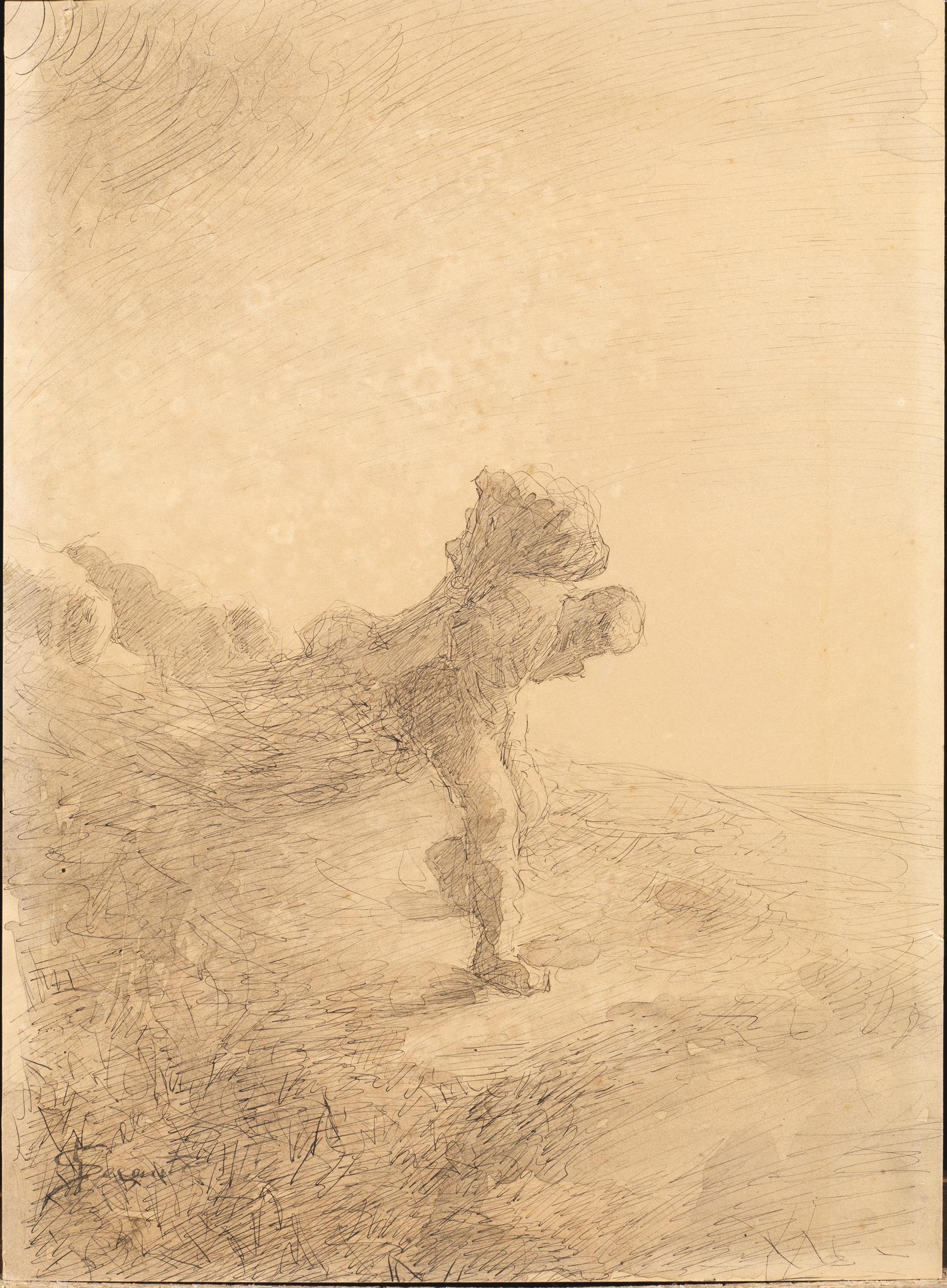 Dall’omonimo dipinto del 1884 oggi presso il Szépmüvészeti Museum di Budapest (Quinsac 389) del quale una seconda versione, di ubicazione sconosciuta, è testimoniata da una fotografia di Pietro Segantini (Quinsac 388). Un preparatorio a matita e gessetto colorato è in collezione privata a Zurigo (Quinsac 390). Altre testimonianze del soggetto dell’uomo carico di fascine sono un disegno al Musée d’Orsay noto anche come Le fascine (Quinsac 392) ed un secondo del 1891 di ubicazione sconosciuta (Quinsac 393).