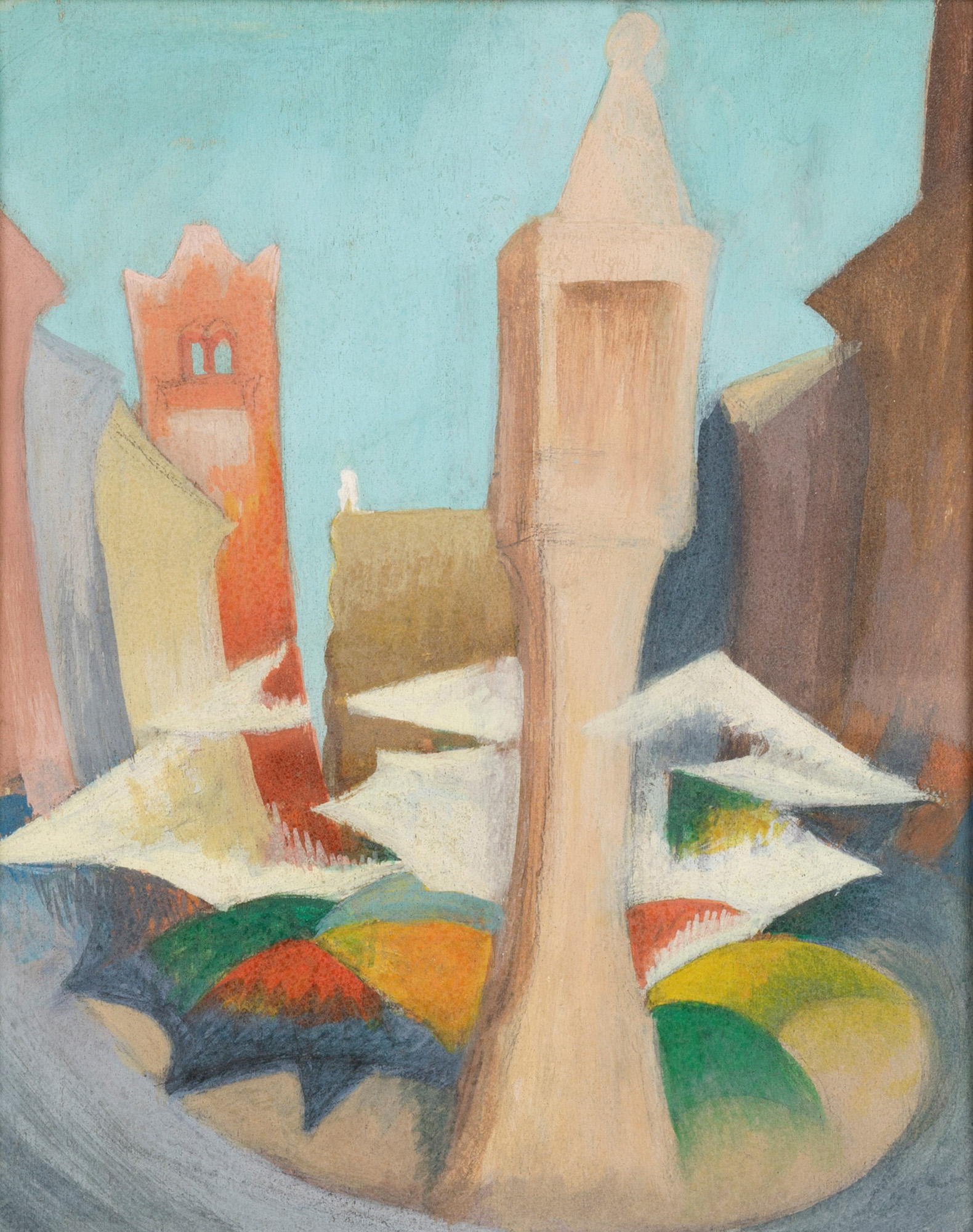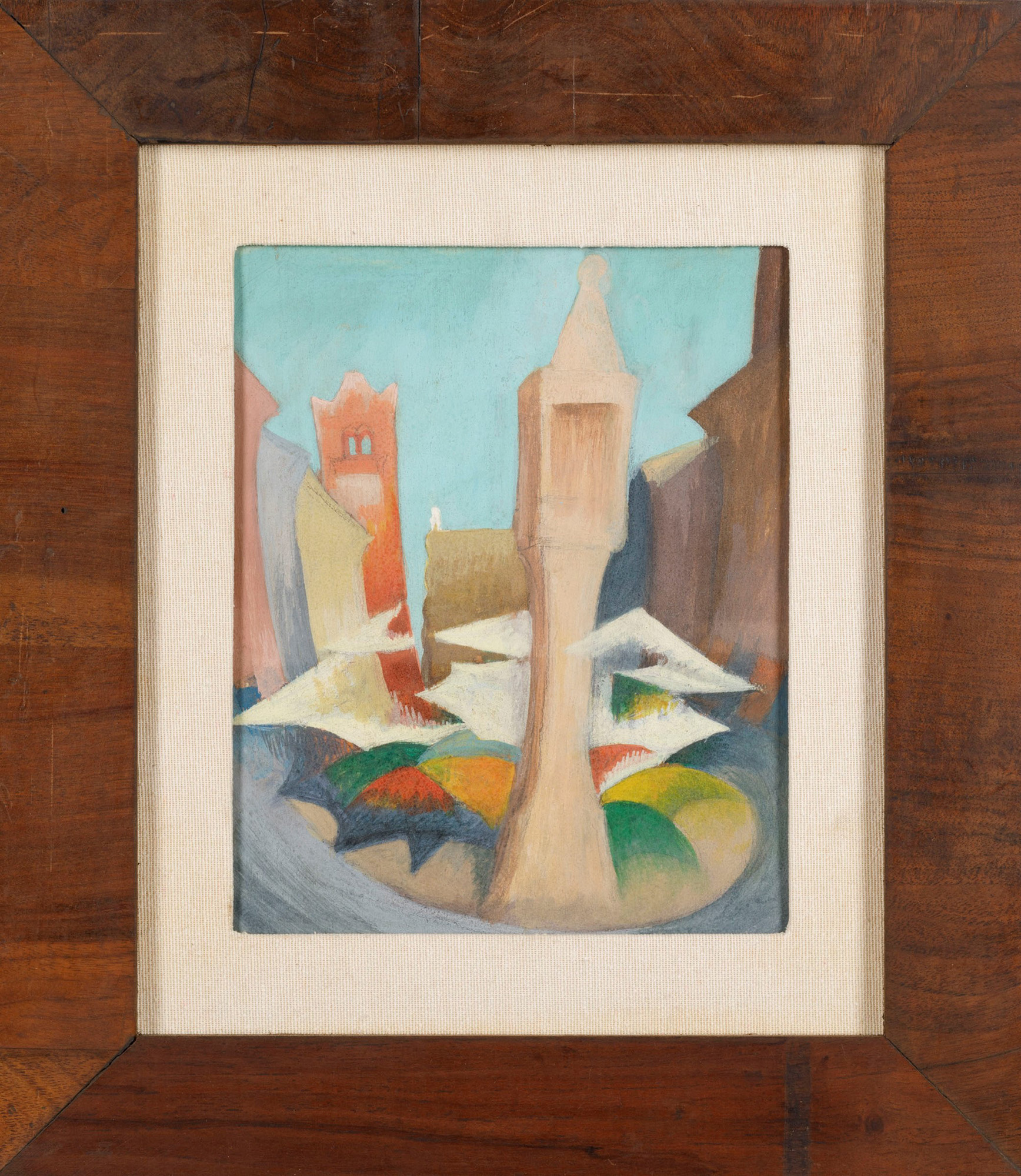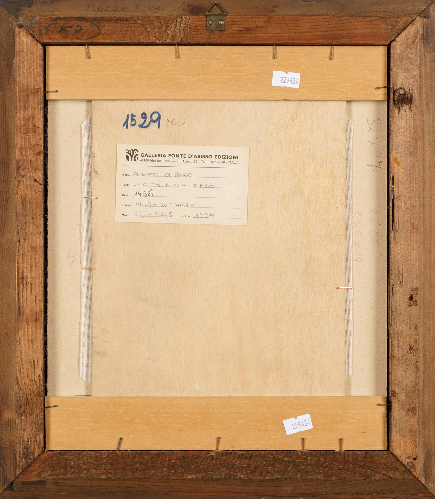 Renato Di Bosso (1905-1982), Veduta Piazza Erbe, 1966, tecnica mista su tavola, cm 24,5x20,5 Etichetta e timbro al retro Galleria Fonte d’Abisso Edizioni, Modena