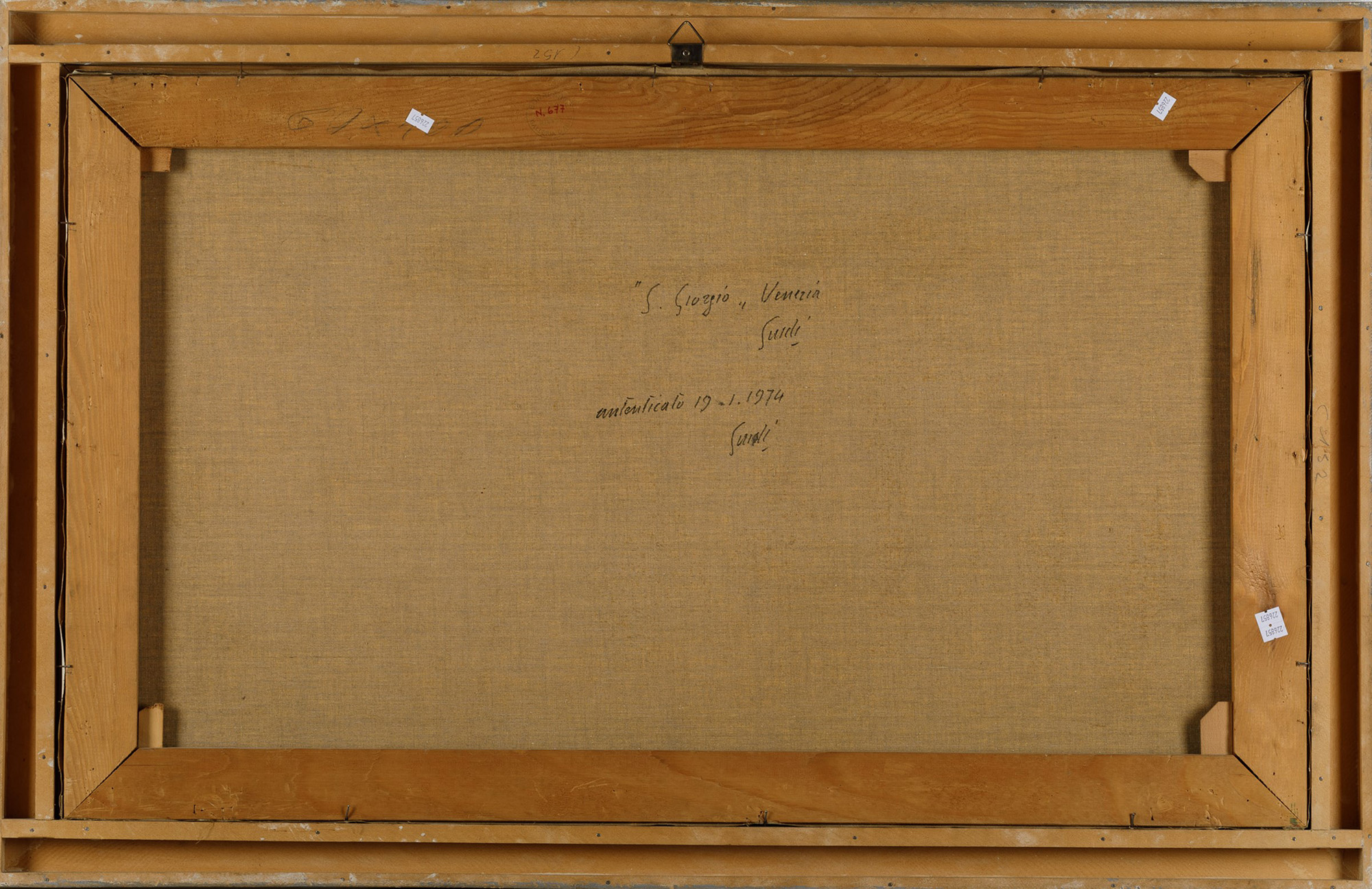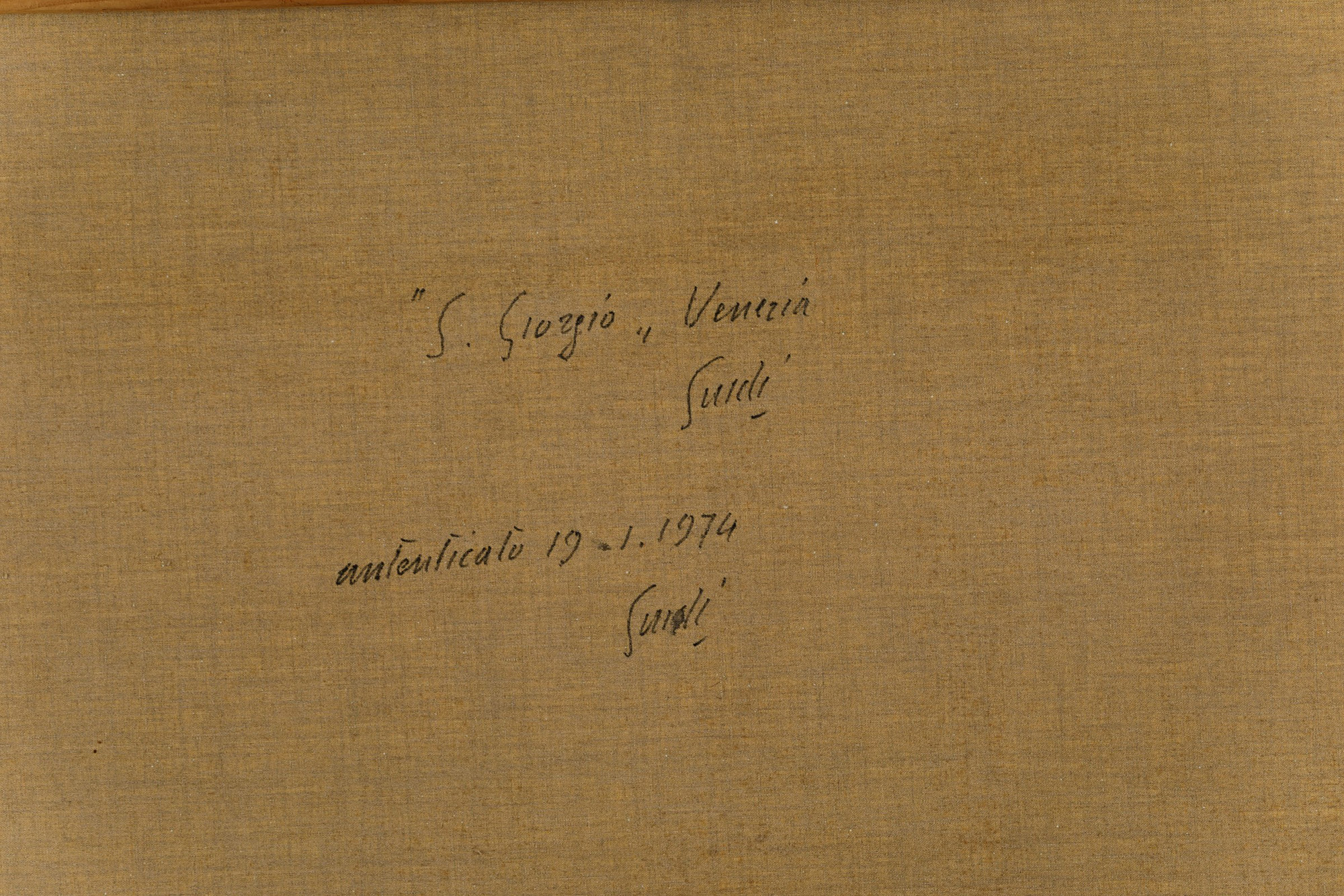 Virgilio Guidi (1892-1984), Veduta dell'Isola di San Giorgio, anni '60, olio su tela, cm 60x100 firmato al retro e autenticato al retro dall'artista il 19/1/1974 Autentica dell’artista su fotografia