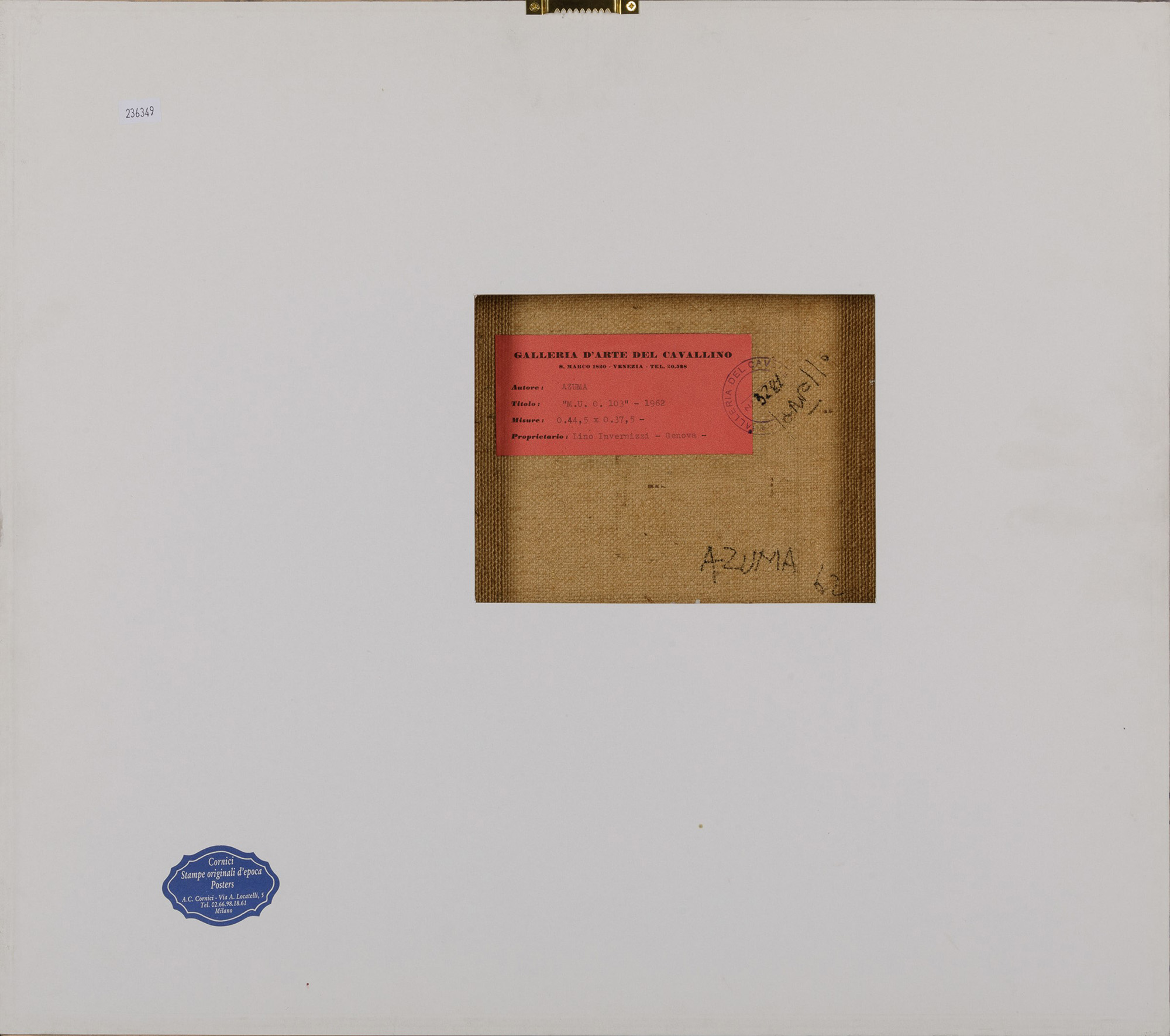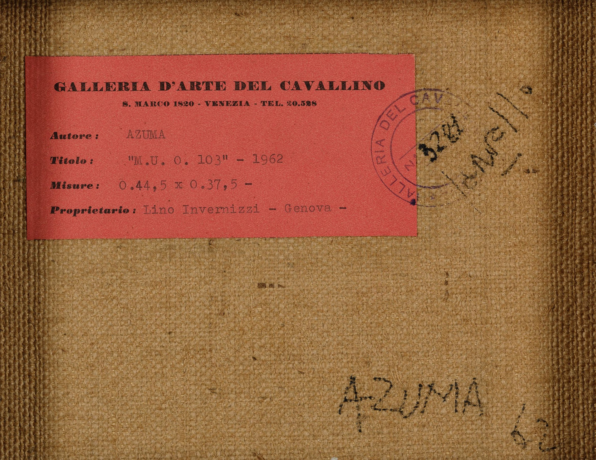 Kenjiro Azuma (1926-2016) , M.U.O.103, 1962, acrilico su tela, cm 44,5x37,5 firmato al retro Etichetta al retro con firma e data Etichetta e timbro al retro della Galleria d'Arte del Cavallino, Venezia