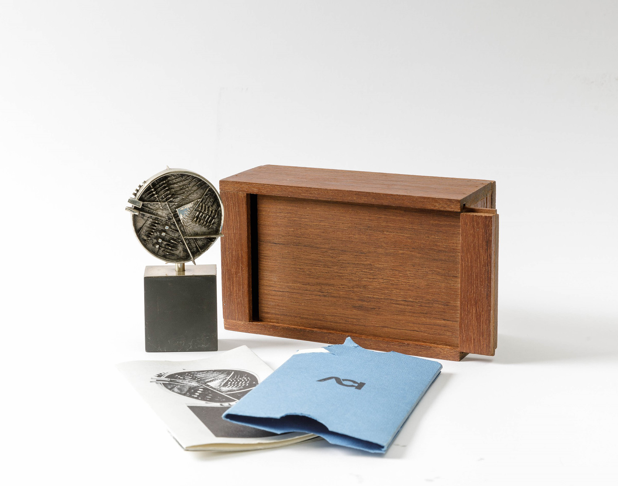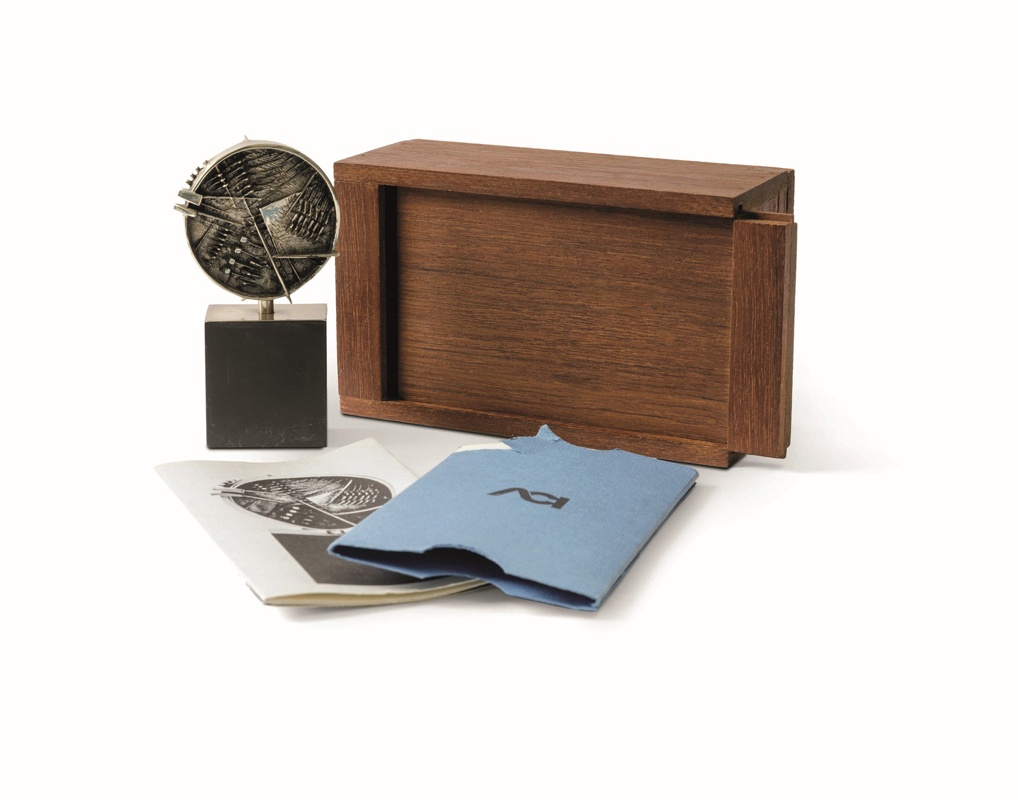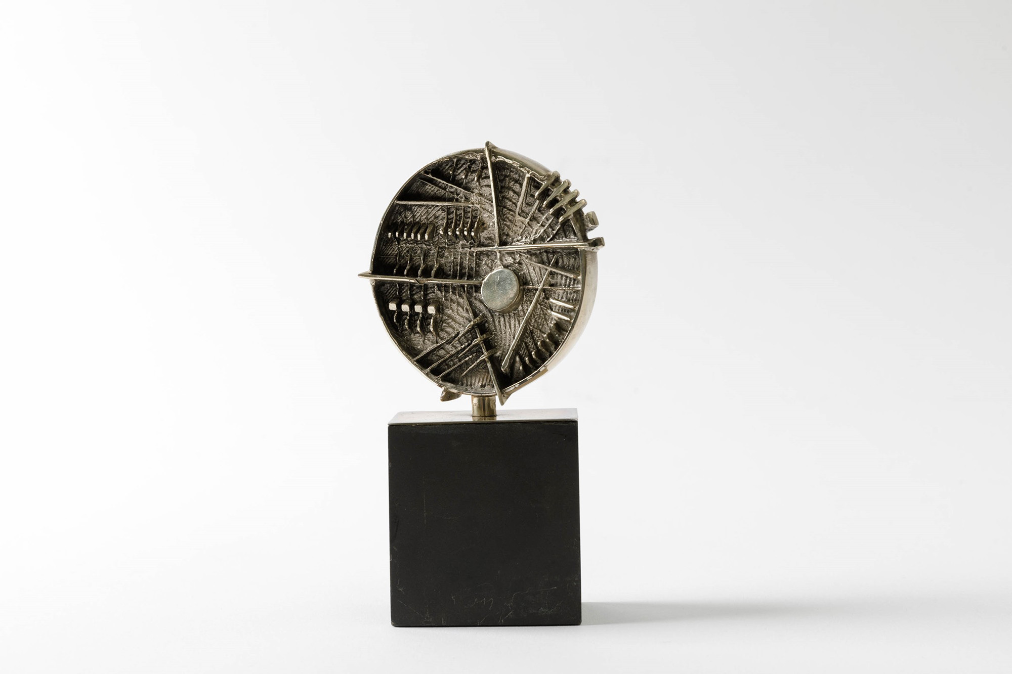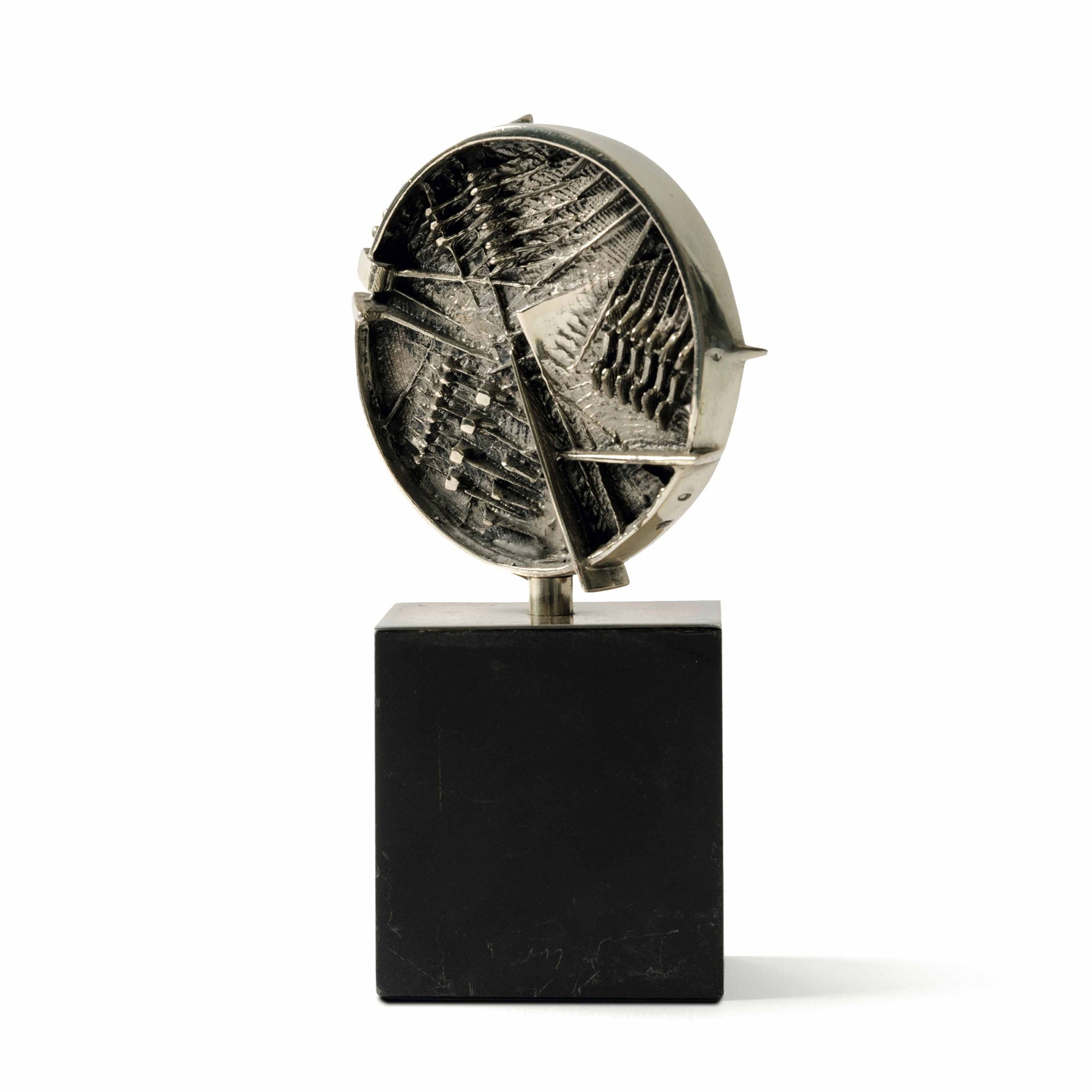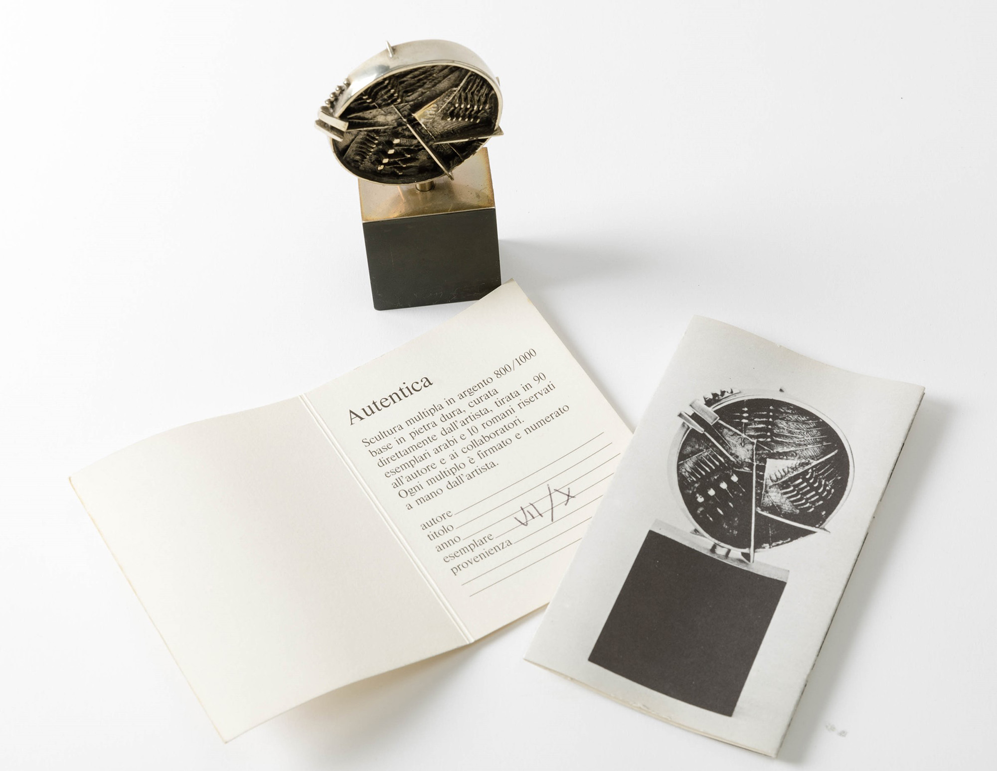 Arnaldo Pomodoro (1926), Ruota per Automobile Club d’Italia, 1979, argento e ardesia, cm 11,5x6,5x2,5 firmato sulla base es. VII/X fusione a cera persa, Microfonderia Geccherle, Milano Tiratura in 90 esemplari numeri arabi + X numeri romani + prove d’artista Edizioni Ars D, Milano Opera registrata presso l’Archivio Arnaldo Pomodoro, Milano, con il n. di archivio M/79/1 Pubblicata nella sezione multipli del Catalogue Raisonné online di Arnaldo Pomodoro con il n. 89