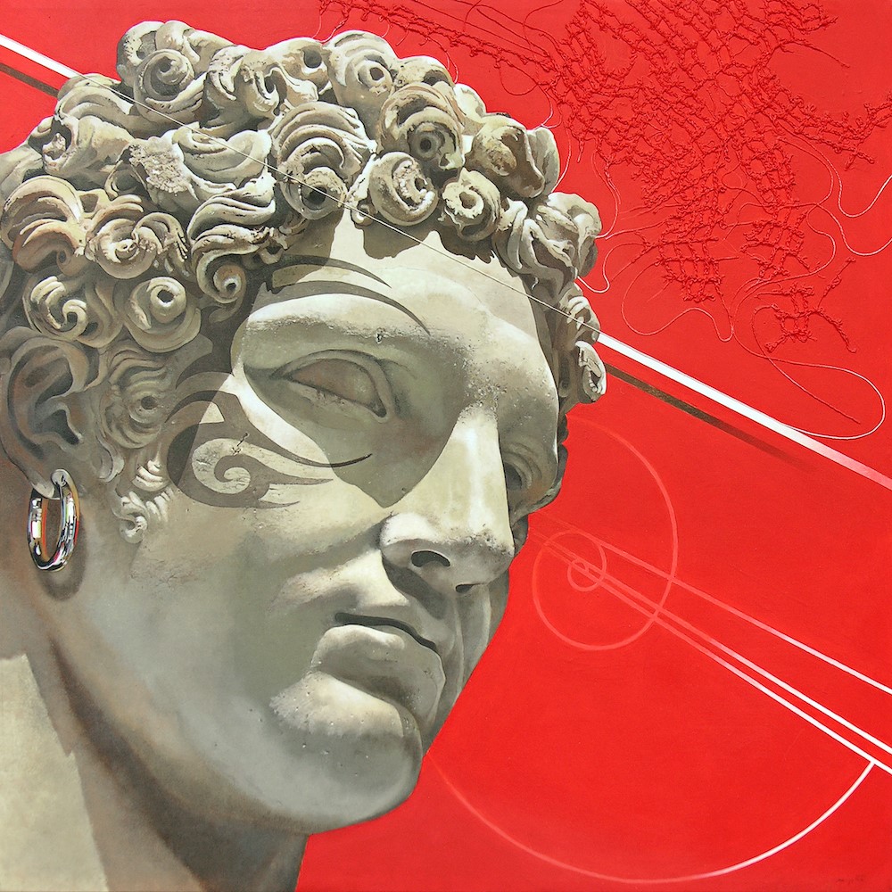 Laura Migotto (1956), Hercules tatoo, 2020, olio su tela, cm 70x70 firmato in basso a destra Timbro e firma al retro dell'artista Opera registrata con il n. OT/20132, accompagnata da certificato di autenticità e archiviazione