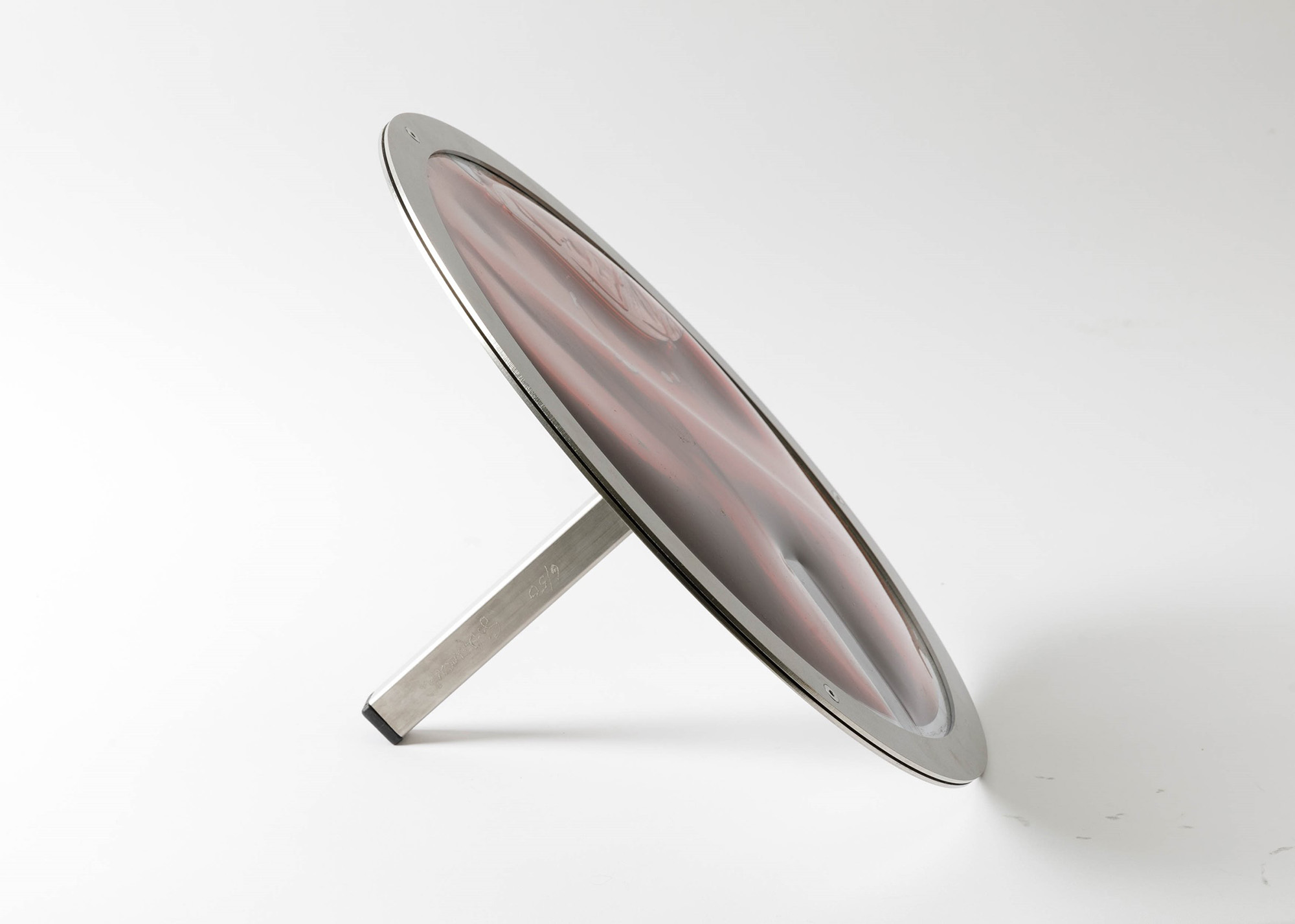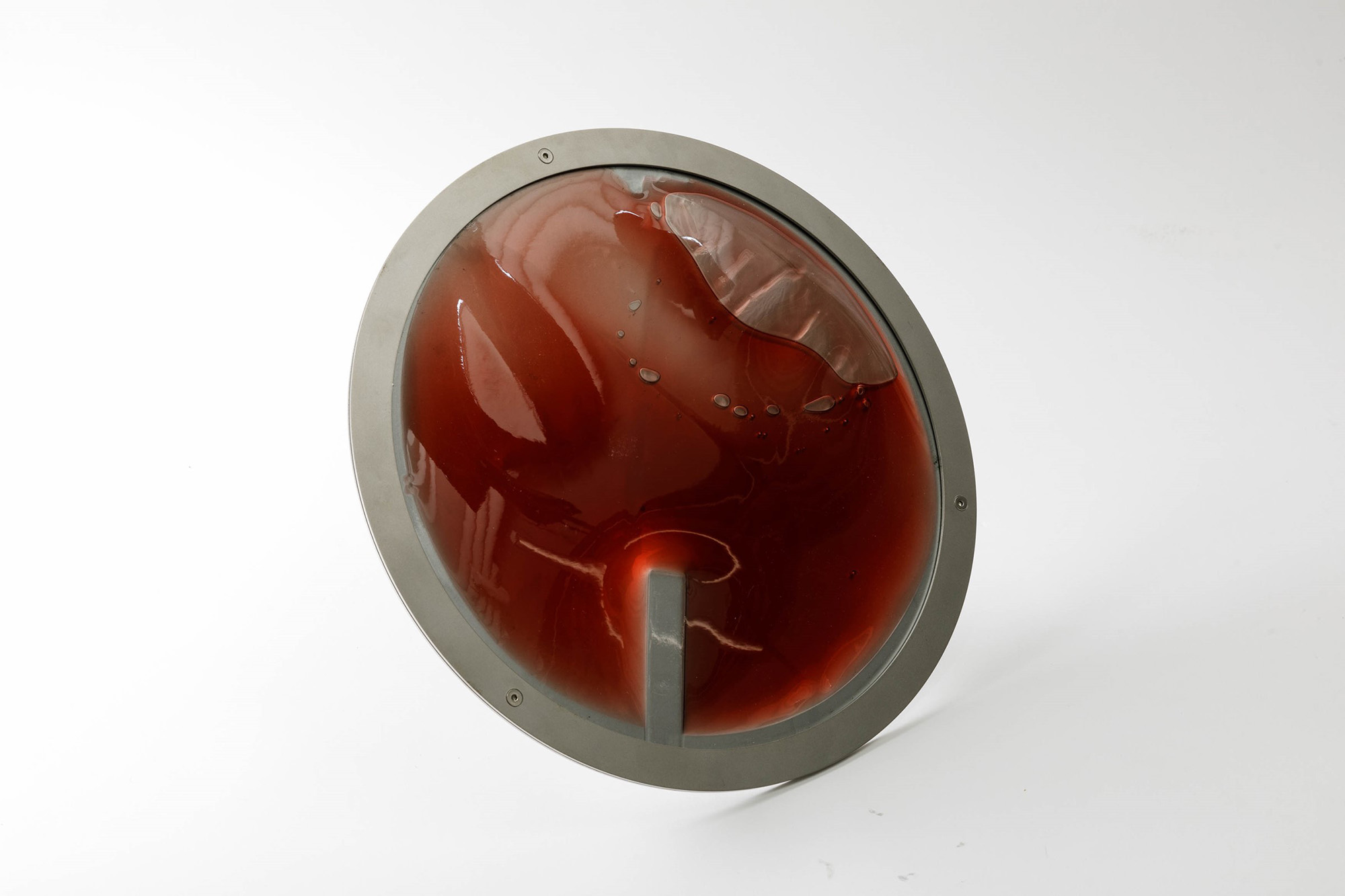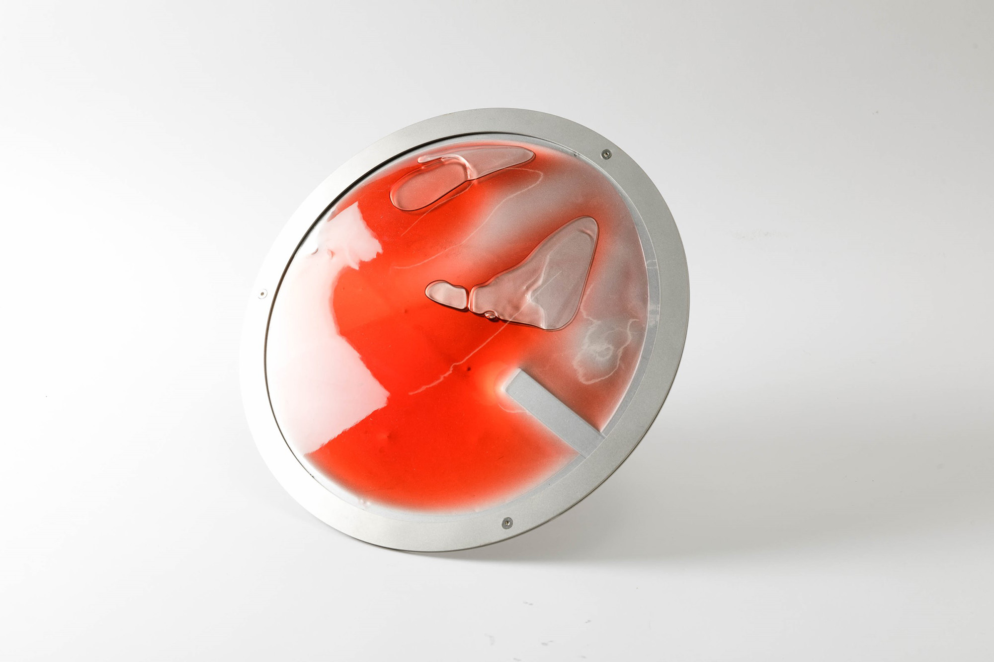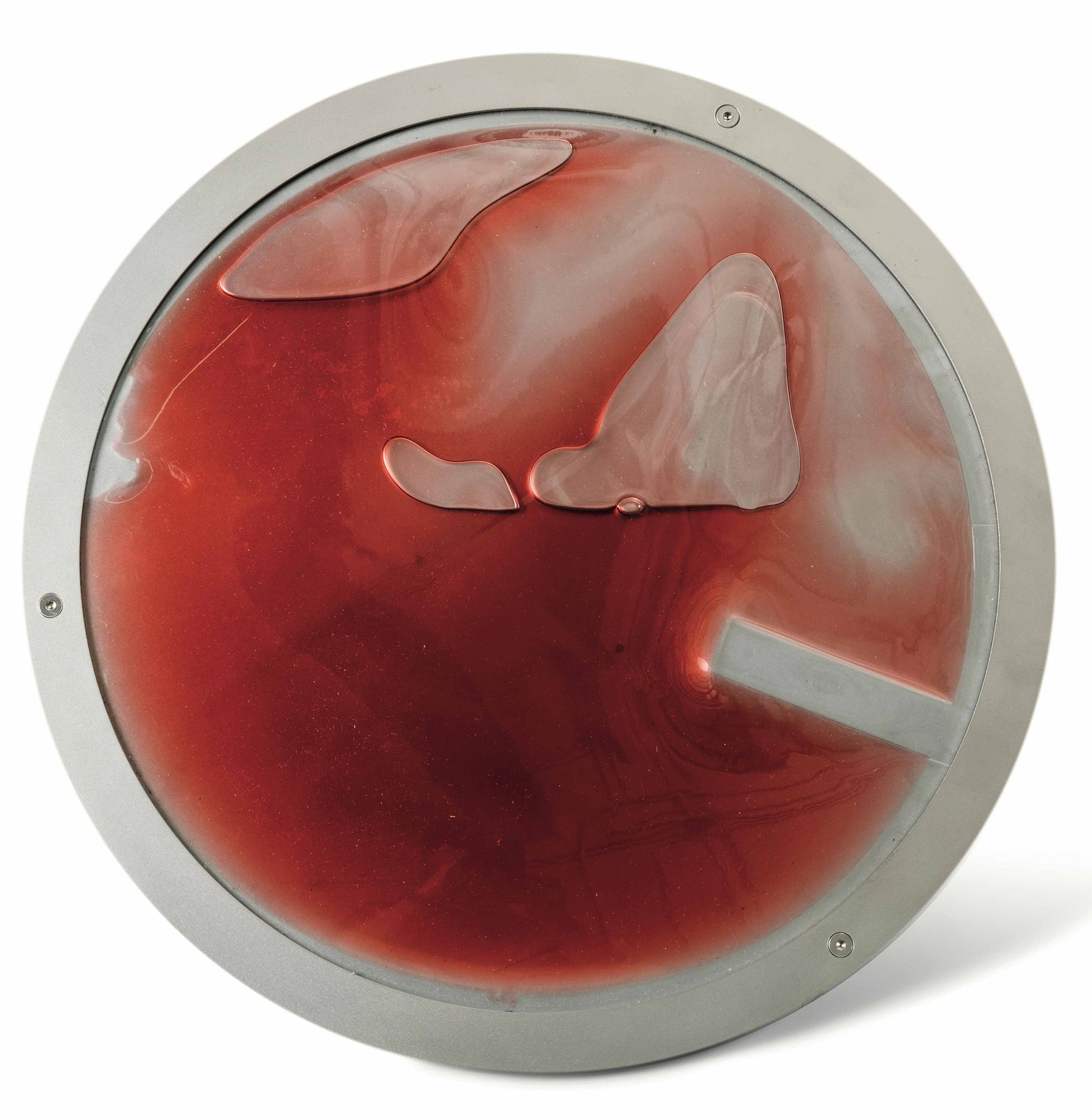 Giovanni Anceschi (1939), Rotololiquido, 2015, olio lubrificante colorato, busta in pvc, acciaio, tappo in plastica, diametro cm 34 firmato es. 6/50 Autentica dell’artista su fotografia. Bibliografia: Giovanni Anceschi. Possibilità liquide, Tega, Publi Paolini, Mantova, 2016, ripr. a cat. p. 126
