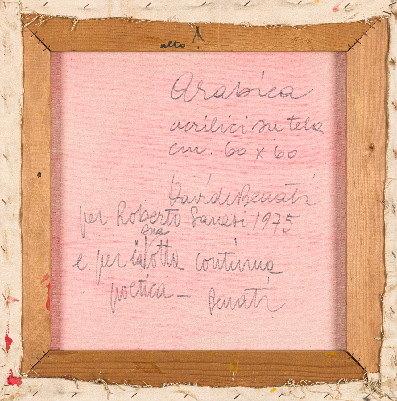 Firma, titolo, tecnica, misure, indicazioni per il posizionamento e dedica ad personam datata 1975 al retro