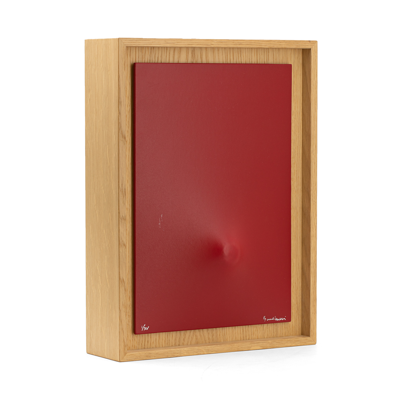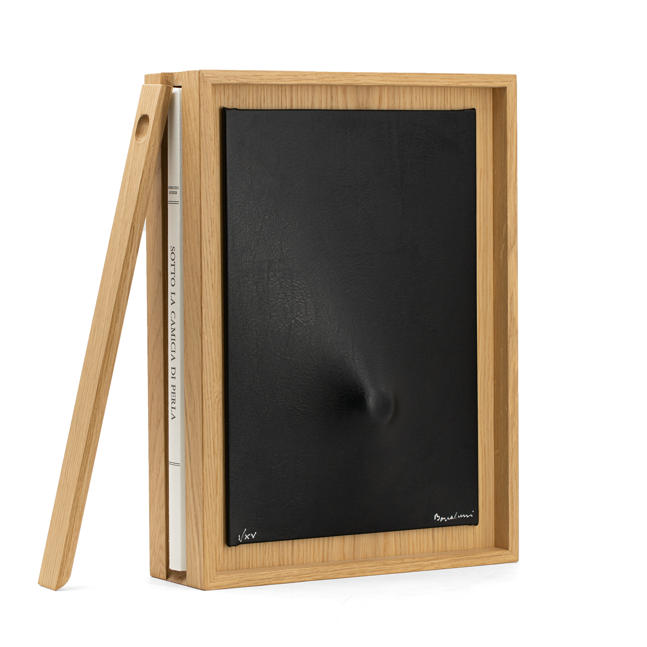 Contenitore in legno bifacciale con estroflessione in cuoio di Agostino Bonalumi sul fronte e sul retro, contenente il volume "Sotto la camicia di perla" con 20 poesie inedite di Sebastiano Grasso e una carta estroflessa di Agostino Bonalumi all'interno
