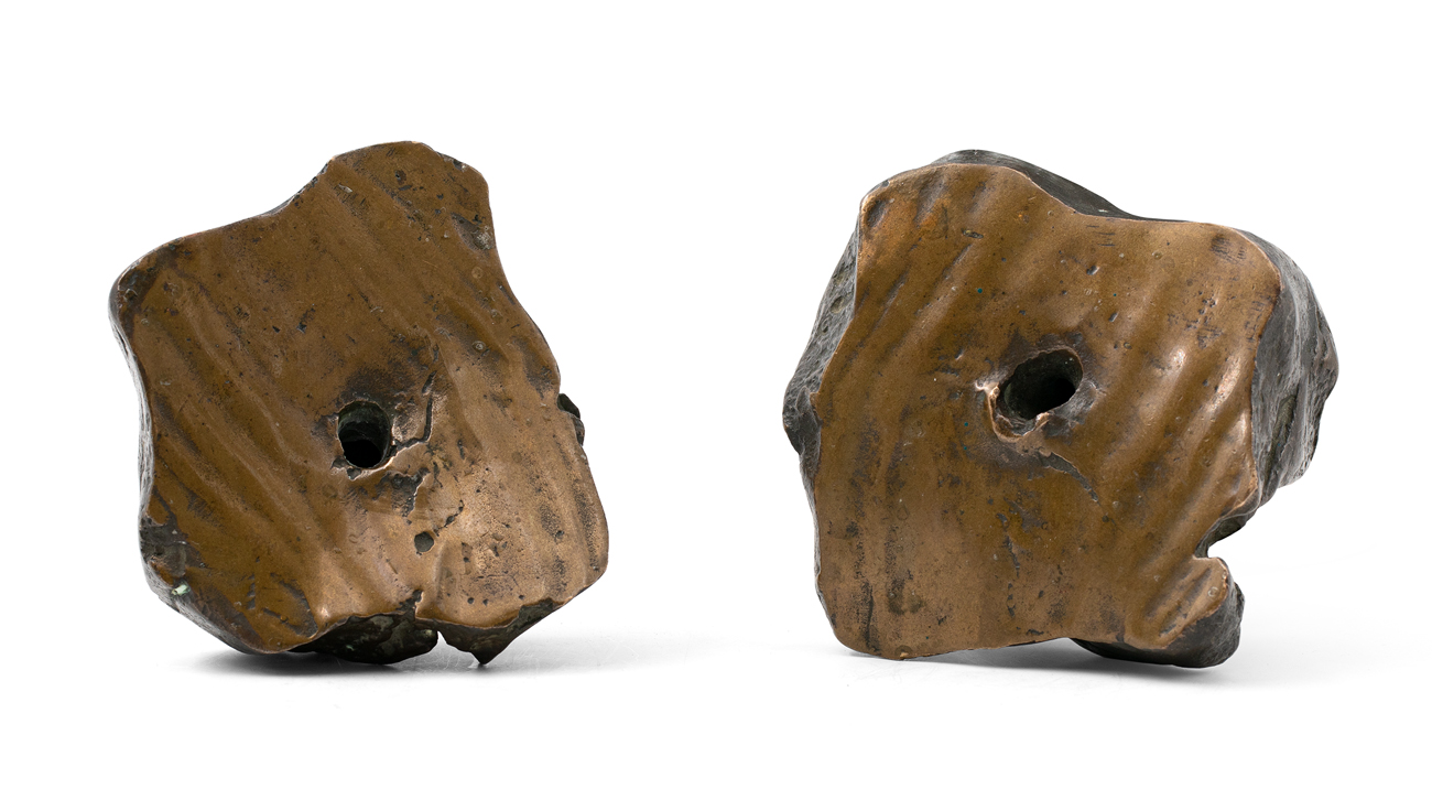 Coppia di sculture in bronzo parzialmente lucidato con una patina marrone e verde