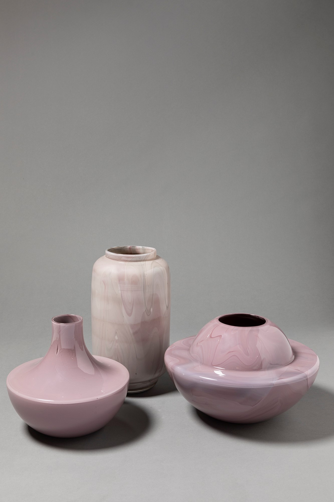 Mario Pinzoni - Tre vasi in vetro soffiato calcedonio. Etichetta originale