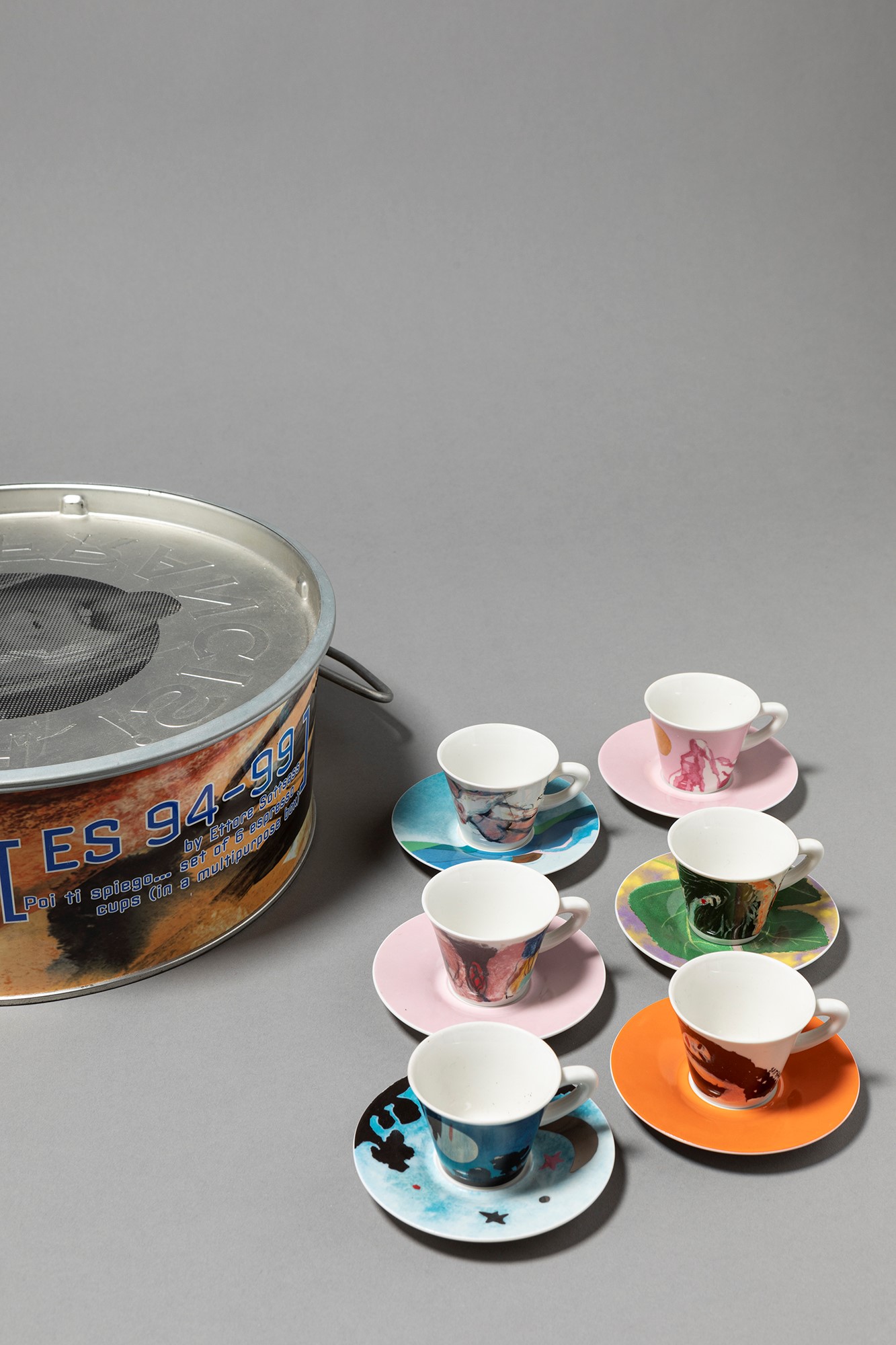 Ettore Sottsass - Servizio da caffè modello “Poi ti spiego” composto da 6 tazzine e 6 piattini in scatola originale in metallo.