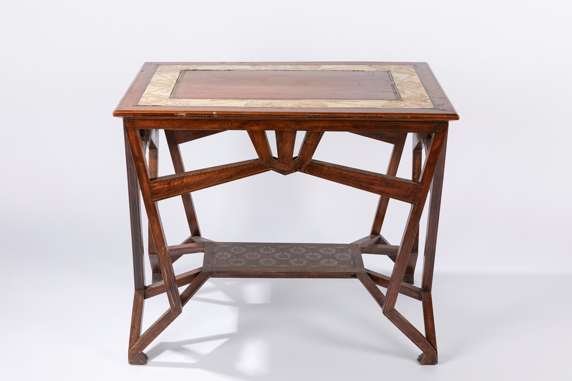 Antonio De Vecchi - Tavolo in mogano tinto con piano rettangolare sagomato; decoro dorato e rosso