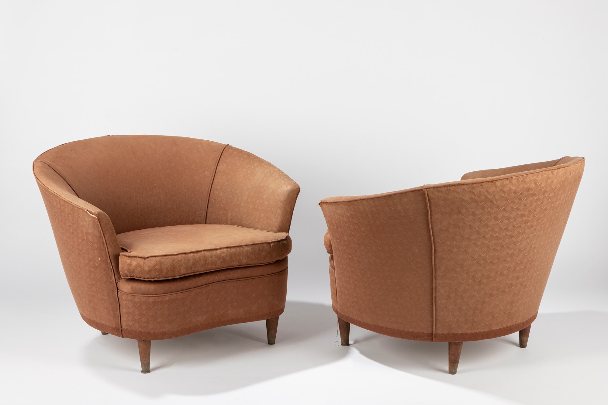 Manifattura Italiana - Coppia di poltrone a pozzetto con piedi in legno e rivestimento in tessuto.