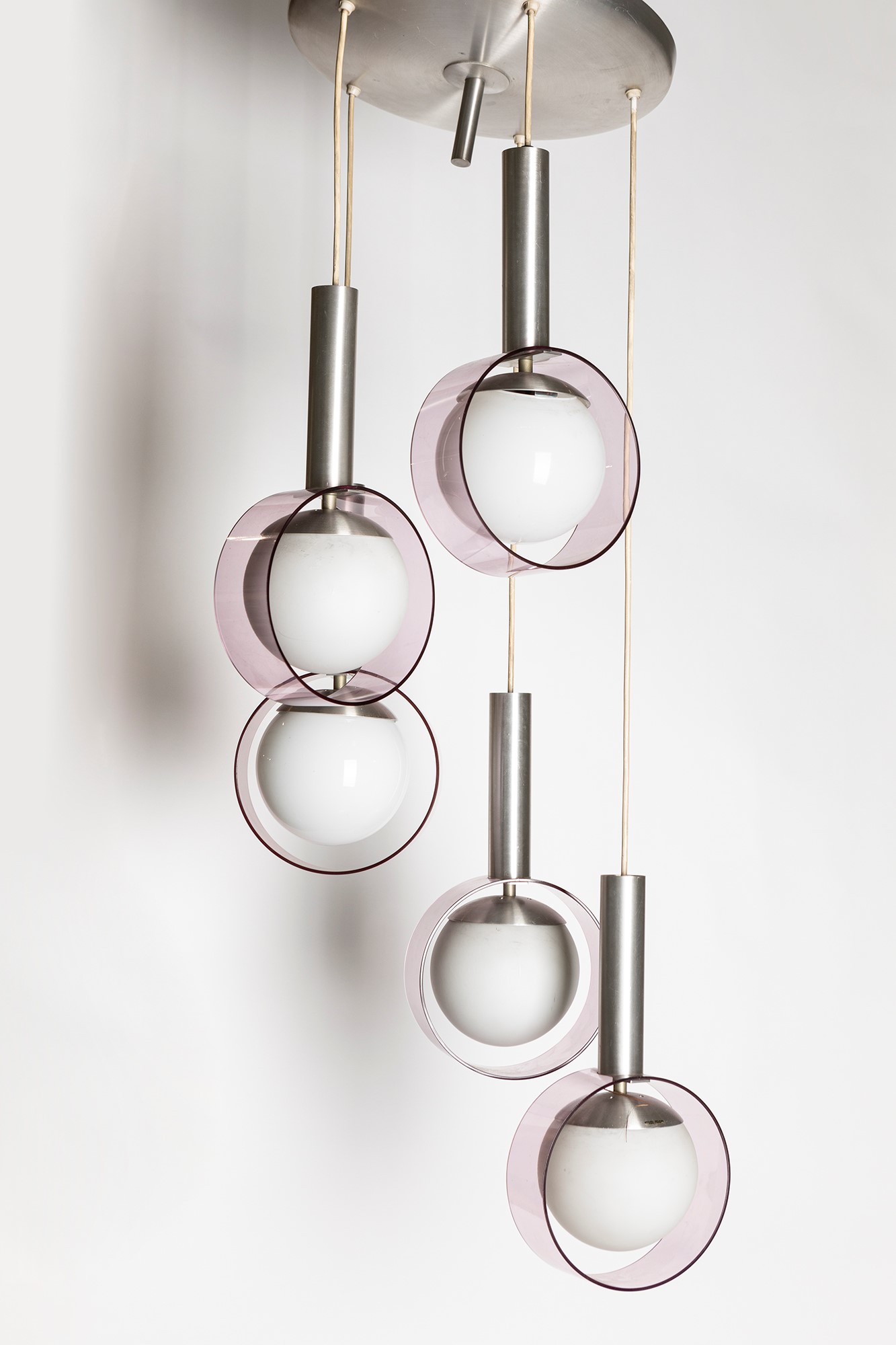 Stilux - Lampadario a sospensione a cinque luci con struttura in metallo, diffusori in vetro opalino e metacrilato rosa