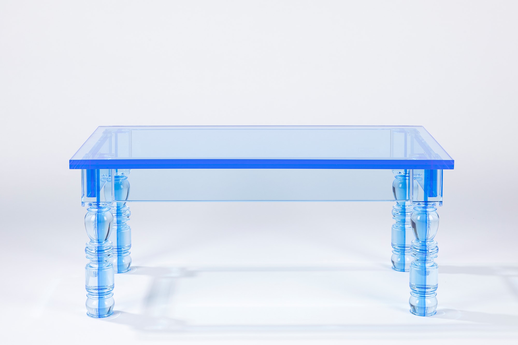 Studio Superego - Tavolino Post Rural in plexiglass azzurro, rivisitazione del design rurale.