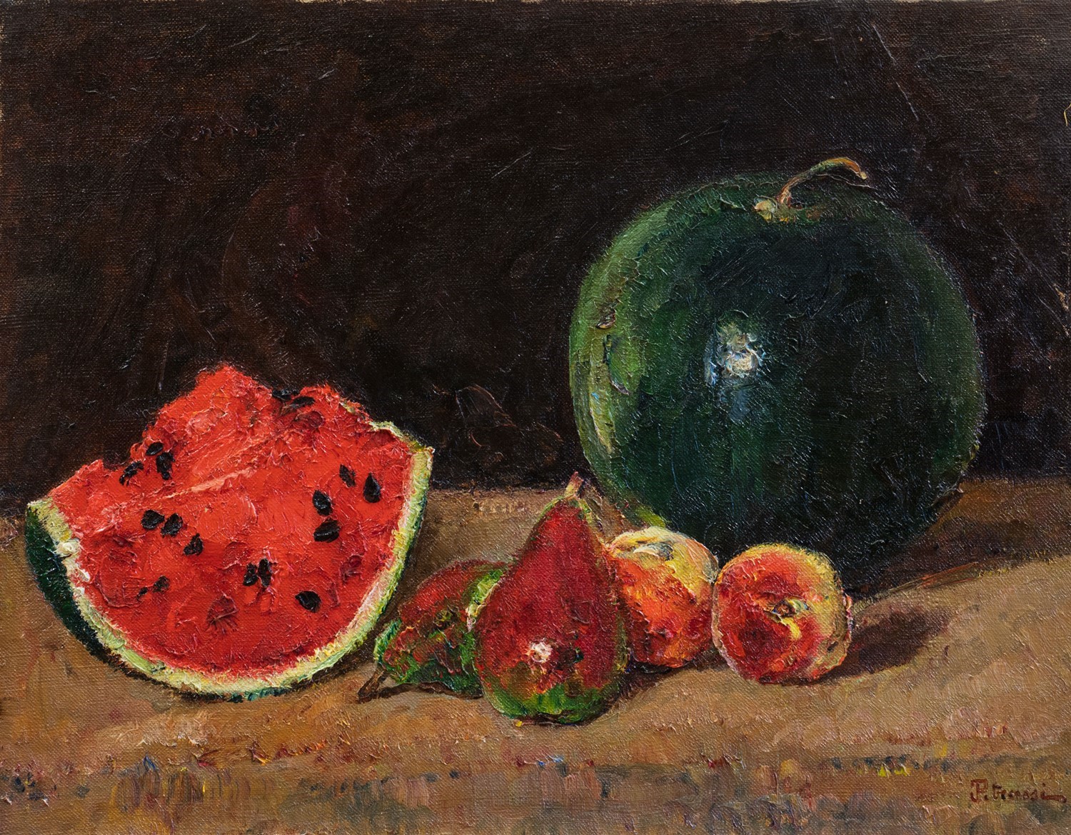 Luigi Petrassi (Zagarolo 1868-Roma 1948) - Natura morta con pesche, pere e cocomero