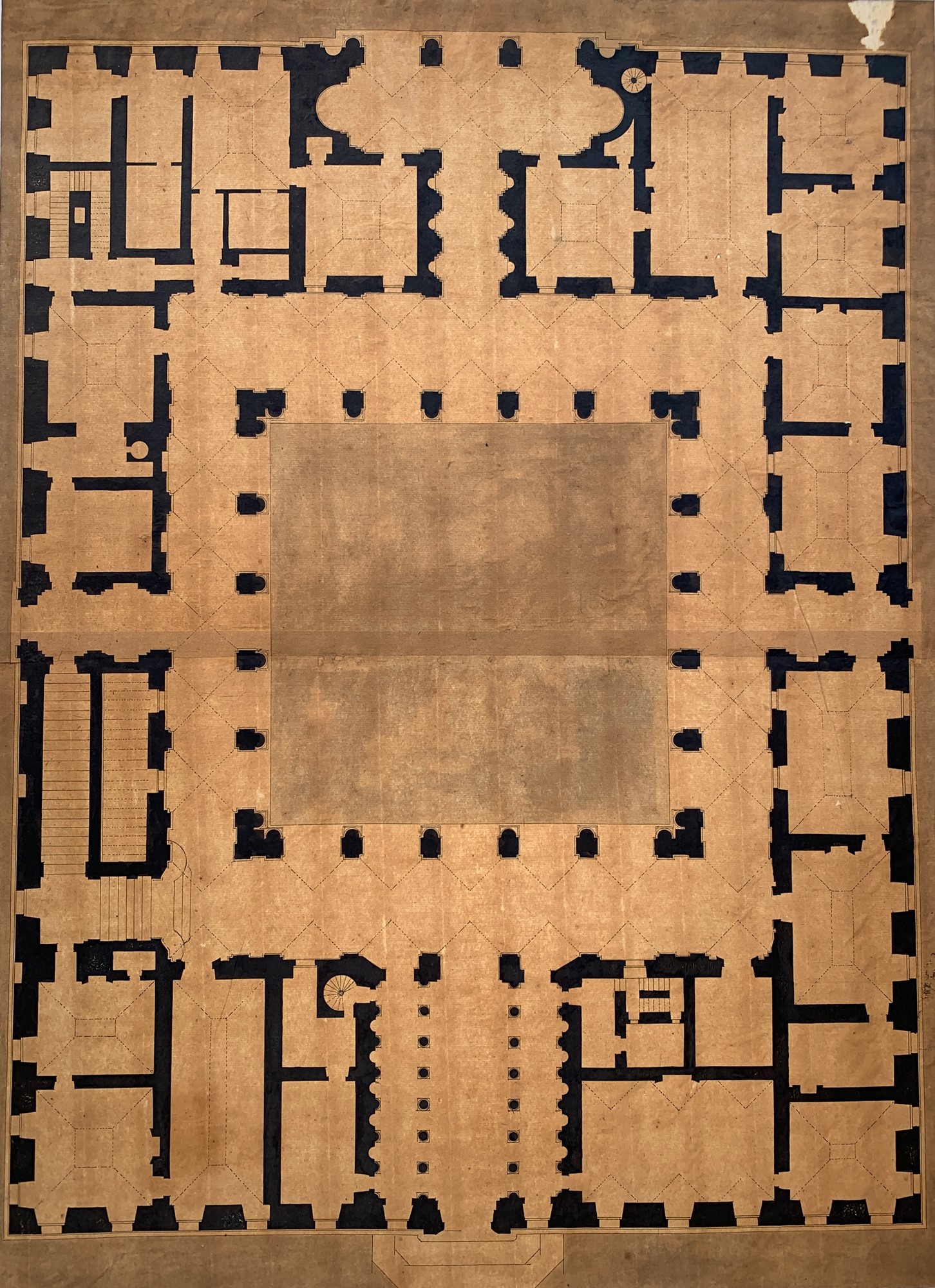 a) Palazzo della Consulta. Pianta delle scuderie e sezione dello scalone, 1824