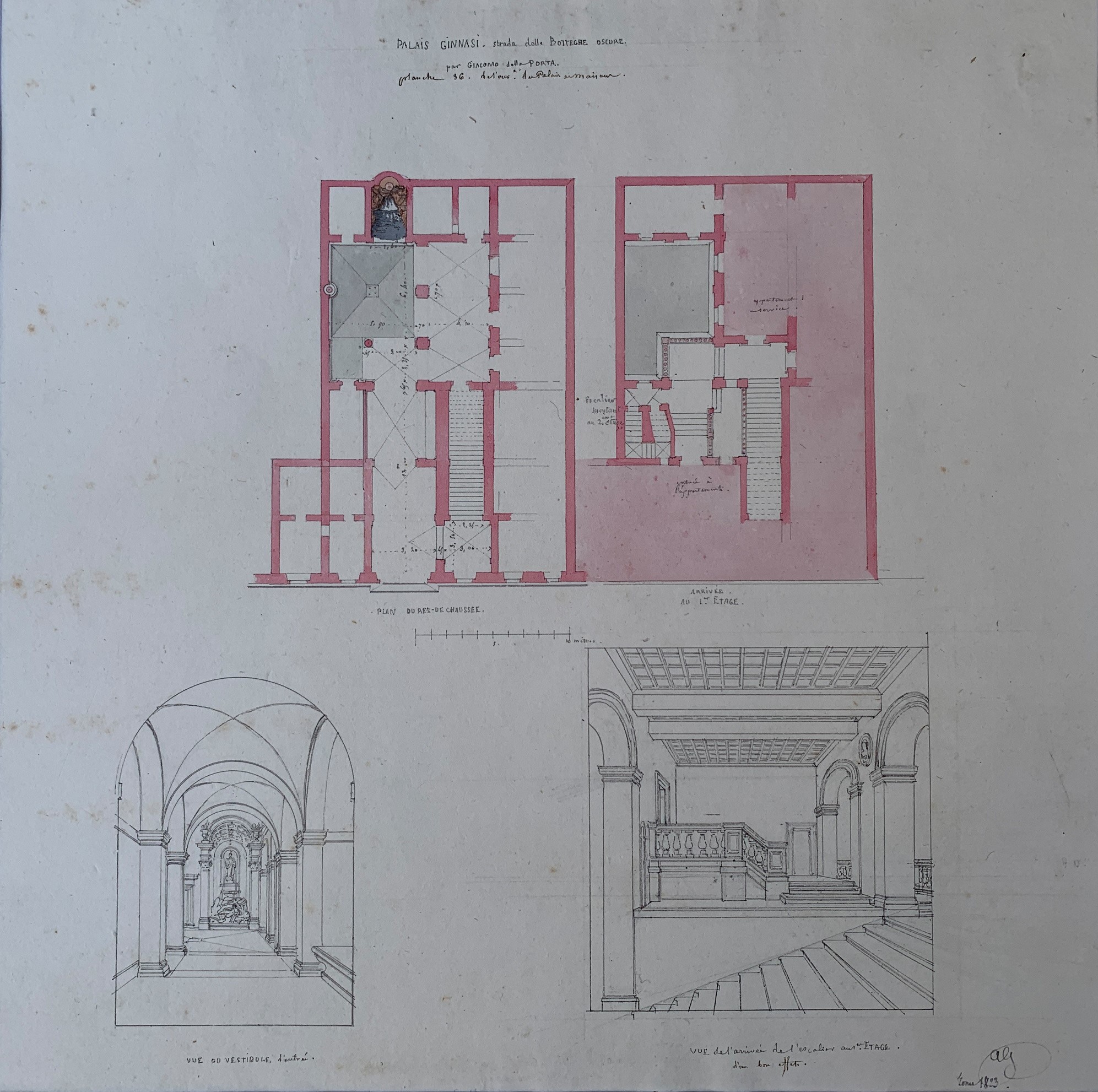 d) Palazzo Ginnasi alle Botteghe Oscure. Piante del piano terra e del primo piano, vedute prospettiche del vestibolo e dello scalone