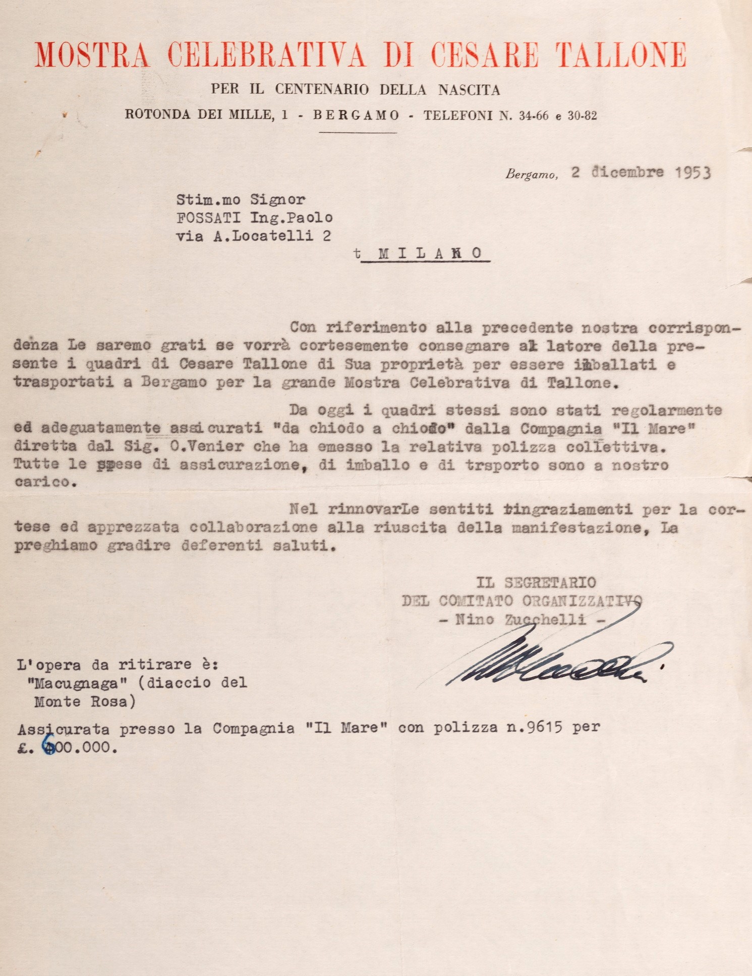 Si allega lettera su carta intestata della Mostra Celebrativa di Cesare Tallone per il centenario della nascita in data 2 dicembre 1953 con richiesta di prestito dell'opera.
