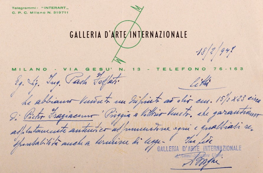 Si allega dichiarazione di vendita in data 18 febbraio 1947 su carta intestata della Galleria d'Arte Internazionale di Milano, con timbro e firma.
