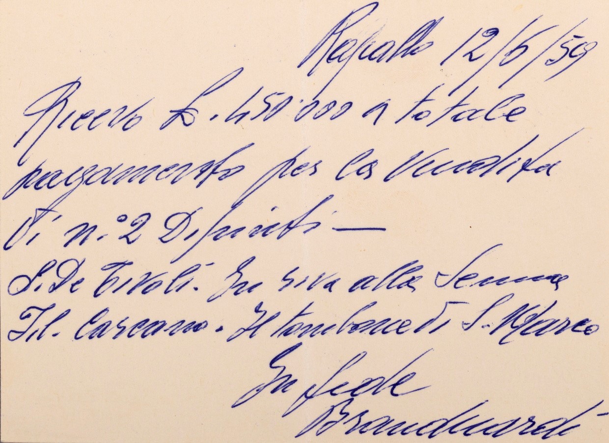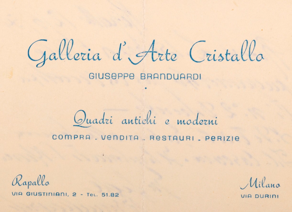 Si allega dichiarazione di vendita in data 12 giugno 1959 relativa al dipinto e ad un'opera di Filippo Carcano a firma di Giuseppe Branduardi, su biglietto della Galleria d'Arte Cristallo, Rapallo e Milano.