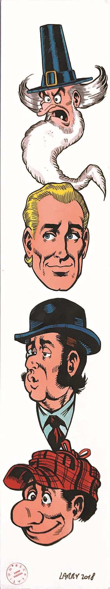 Larry Camarda (1965), Alan Ford, il Numero 1, il Conte Oliver, Bob Rock , Vertical art, ink pencil and coline on Fabriano cardboard. Cm 76x14. Signed and dated 2018.