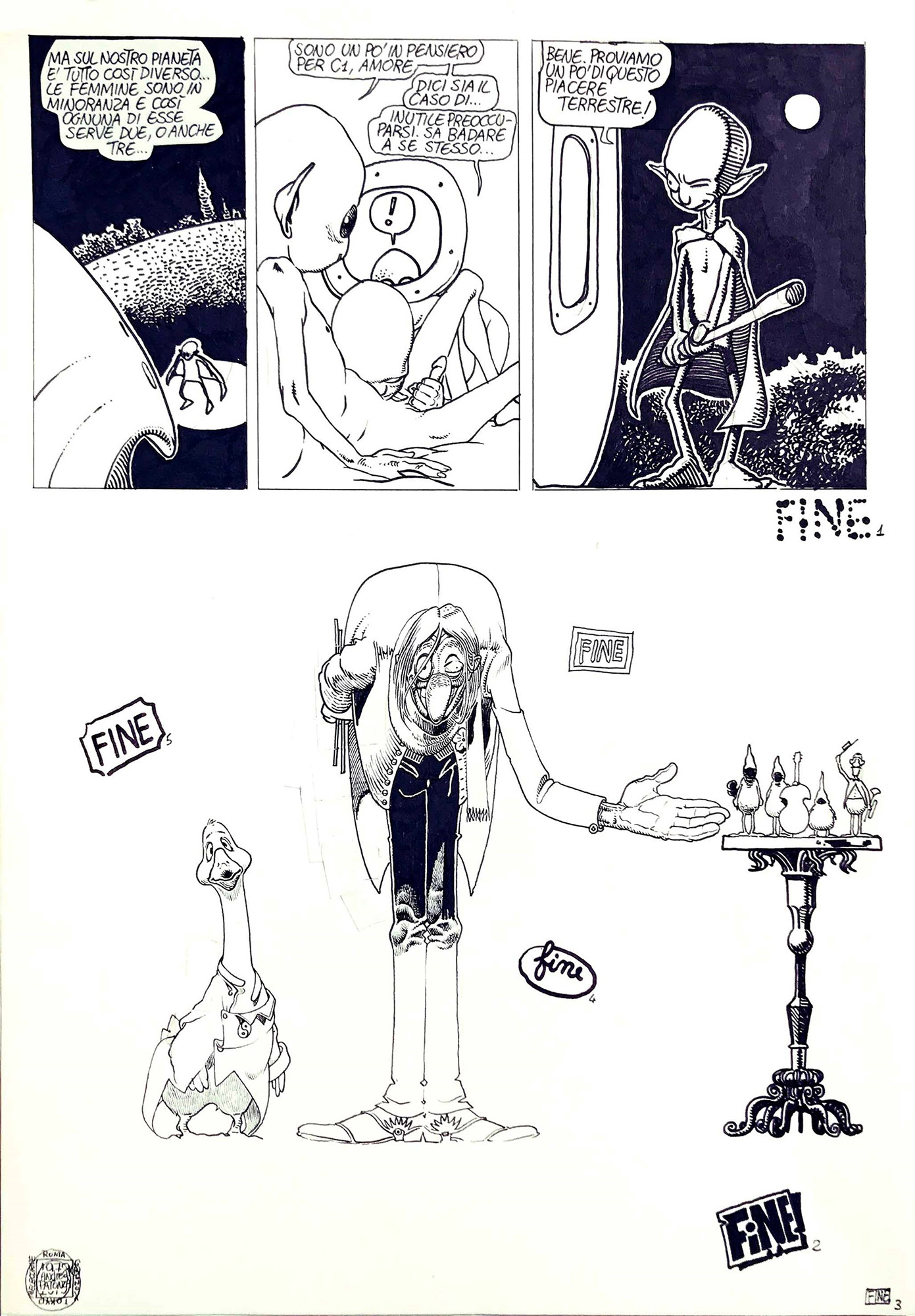 Andrea Pazienza (1956- 1988), Ouverture: Allegro con Fuoco, Final page for the short story published in “Why Pippo Seems a Stoner”. Primo Carnera publisher, early 1980s. Mixed media on cardboard, 42x30 cm. Signed and dated 1979. Excellent condition, with the usual mends applied on the last panel by the artist's due to second thoughts.