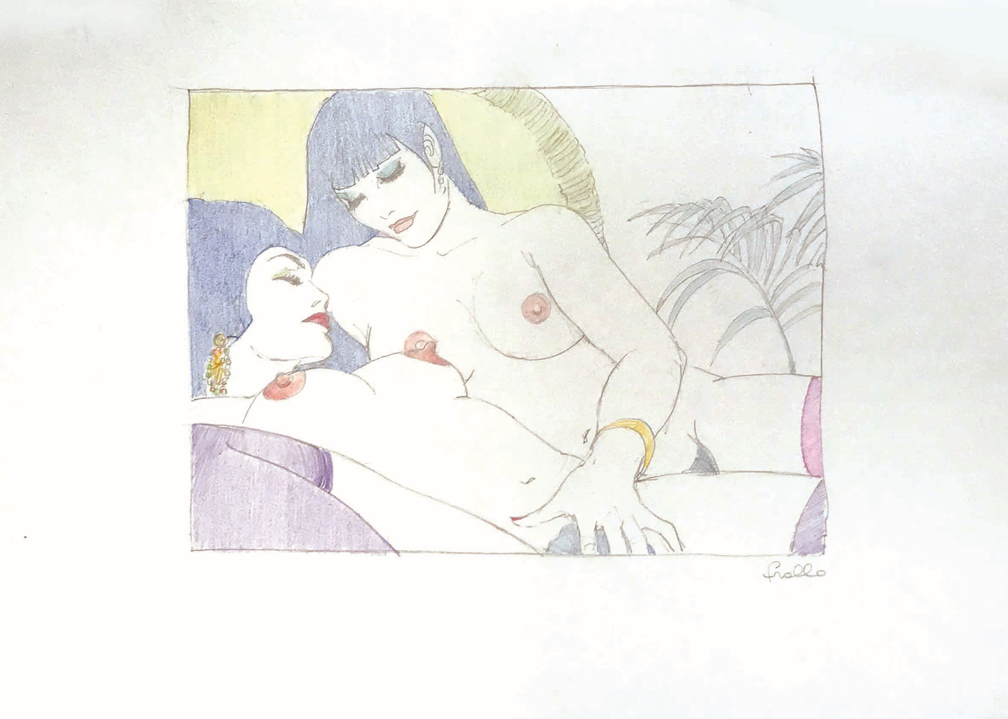 Leone Frollo (1931-2018), Le Amiche , Original illustration, pencil and colored pencils on cardboard. Signed; not dated but about 2010. Very good condition.