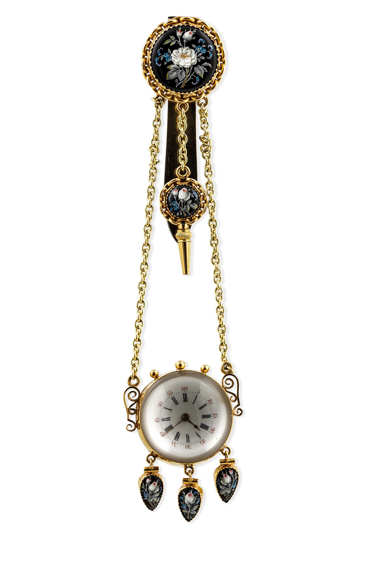 Lot 90 | Orologio spilla francese in oro 18k e smalti con Chatelaine con cassa firmata Chaudè Paris