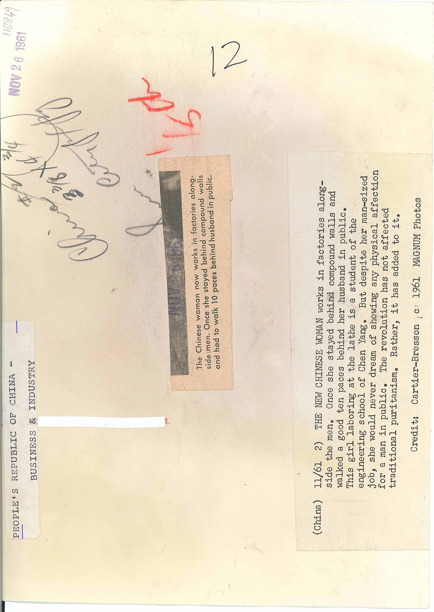 Henri Cartier-Bresson (1908-2004), The new Chinese woman works in factories, 1961. 1961 Vintage Gelatin Silver Print, cm 17,5x24 Etichette al retro Magnum Photos