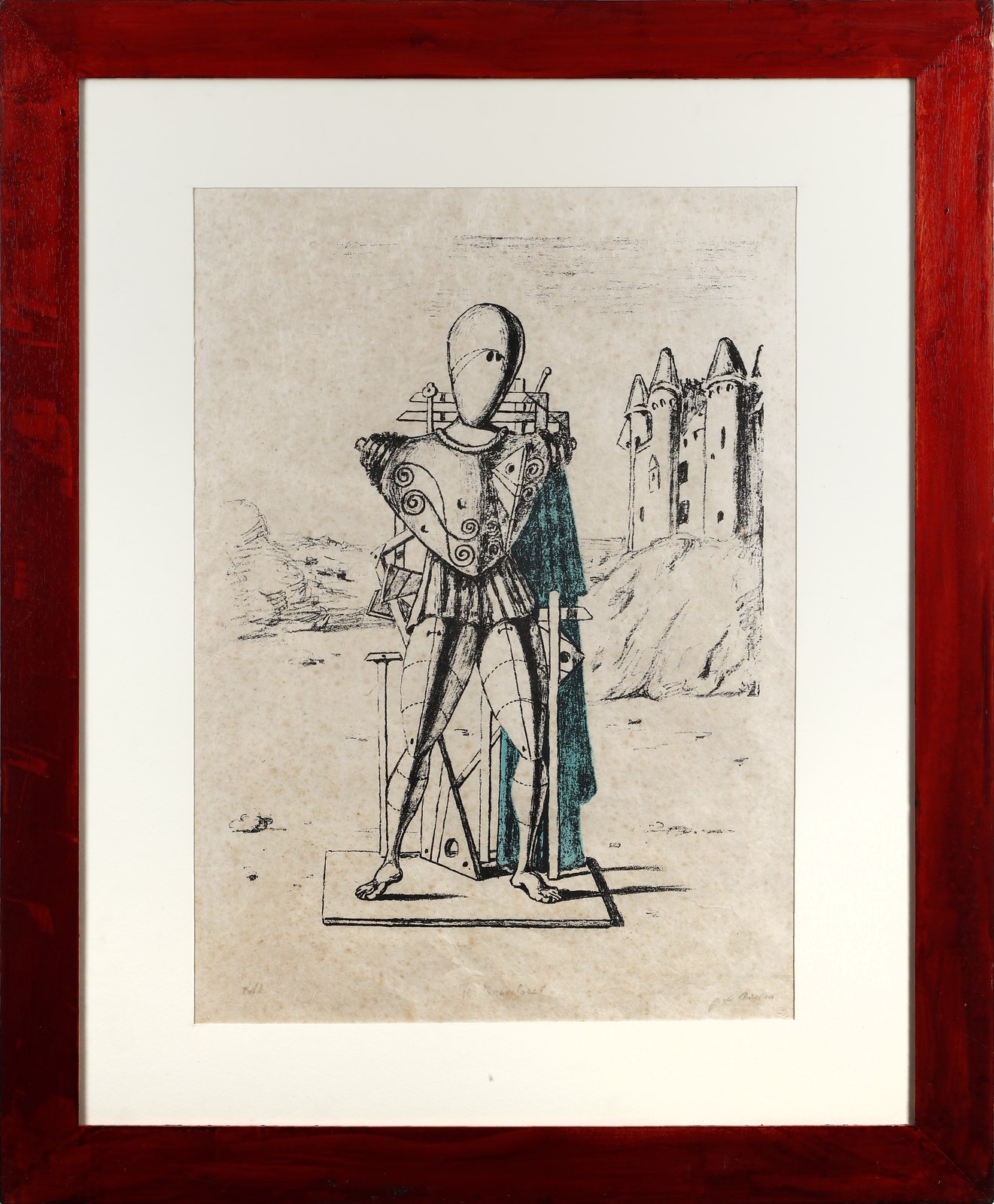 DE CHIRICO GIORGIO (1888 - 1978) Il trovatore. Terza versione: manto verde. 1969. Litografia su carta di riso. Cm 53,50 x 70,50. P.d.a. Tiratura , titolo e firma in basso a matita. Timbro a secco Alberto Caprini, Roma, in basso a destra. Edizione totale: 60 esemplari numerati da 1/60 a 60/60; 15 esemplari numerati da I/XV a XV/XV; 21 esemplari su carta Japon siglati con le lettere da A a Z + p.d.a. Pubblicazioni: Giorgio De Chirico, Catalogo dell'opera Grafica 1969 - 1977, Edizioni Bora, a cura di Edoardo Brandi, pag. 83, tav.65. Berenice, Torino 1975; W.Schmied, Aosta 1981; F.Sìmongini - A De Angelis, Roma 1989; F.Ulivi, Ischia 1989, Policoro 1990; D. Guzzi - R.Dottori, Colonnella, 1998. Difetti. Cornice presente